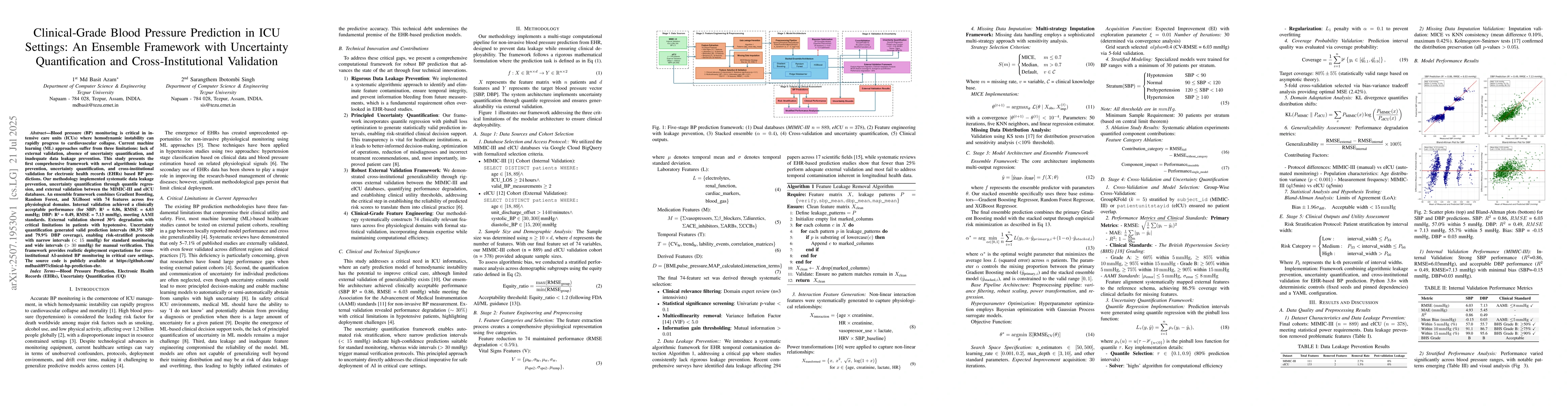 Blood pressure (BP) monitoring is critical in in tensive care units (ICUs) where hemodynamic instability can rapidly progress to cardiovascular collapse. Current machine learning (ML) approaches suffer from three limitations: lack of external validation, absence of uncertainty quantification, and inadequate data leakage prevention. This study presents the first comprehensive framework with novel algorithmic leakage prevention, uncertainty quantification, and cross-institutional validation for electronic health records (EHRs) based BP pre dictions. Our methodology implemented systematic data leakage prevention, uncertainty quantification through quantile regres sion, and external validation between the MIMIC-III and eICU databases. An ensemble framework combines Gradient Boosting, Random Forest, and XGBoost with 74 features across five physiological domains. Internal validation achieved a clinically acceptable performance (for SBP: R^2 = 0.86, RMSE = 6.03 mmHg; DBP: R^2 = 0.49, RMSE = 7.13 mmHg), meeting AAMI standards. External validation showed 30% degradation with critical limitations in patients with hypotensive. Uncertainty quantification generated valid prediction intervals (80.3% SBP and 79.9% DBP coverage), enabling risk-stratified protocols with narrow intervals (< 15 mmHg) for standard monitoring and wide intervals (> 30 mmHg) for manual verification. This framework provides realistic deployment expectations for cross institutional AI-assisted BP monitoring in critical care settings. The source code is publicly available at https://github.com/ mdbasit897/clinical-bp-prediction-ehr.