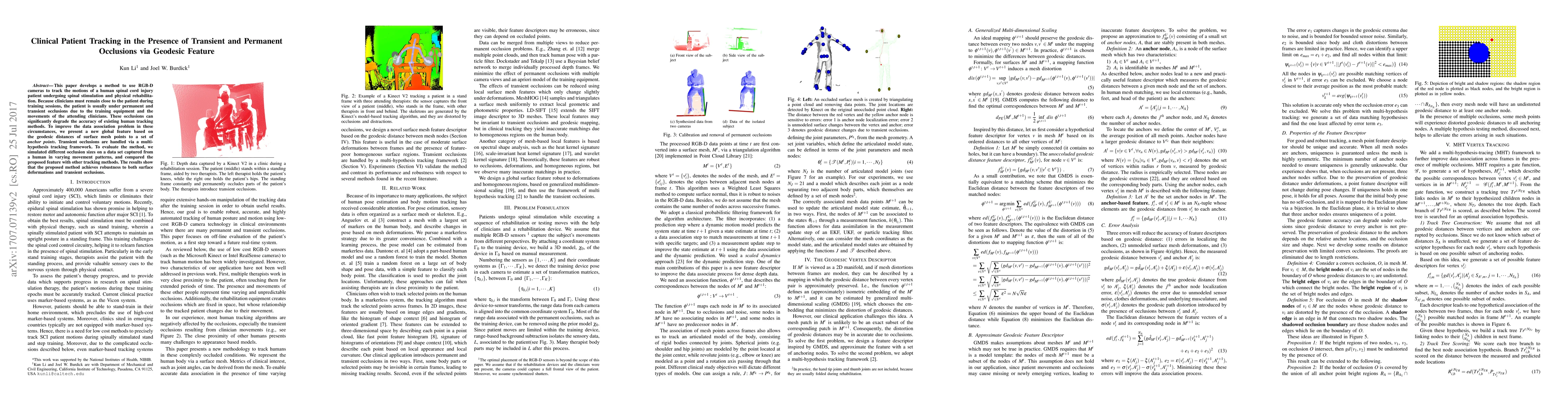 This paper develops a method to use RGB-D cameras to track the motions of a human spinal cord injury patient undergoing spinal stimulation and physical rehabilitation. Because clinicians must remain close to the patient during training sessions, the patient is usually under permanent and transient occlusions due to the training equipment and the movements of the attending clinicians. These occlusions can significantly degrade the accuracy of existing human tracking methods. To improve the data association problem in these circumstances, we present a new global feature based on the geodesic distances of surface mesh points to a set of anchor points. Transient occlusions are handled via a multi-hypothesis tracking framework. To evaluate the method, we simulated different occlusion sizes on a data set captured from a human in varying movement patterns, and compared the proposed feature with other tracking methods. The results show that the proposed method achieves robustness to both surface deformations and transient occlusions.