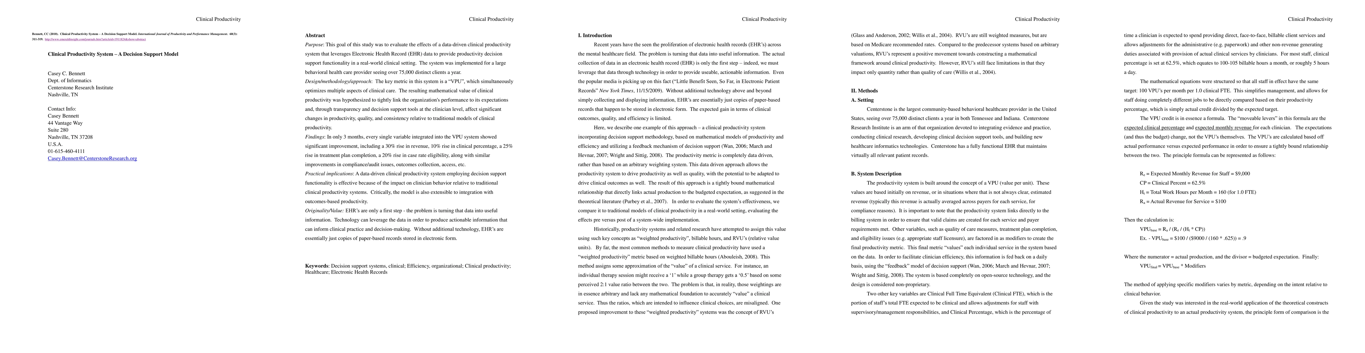 Purpose: This goal of this study was to evaluate the effects of a data-driven clinical productivity system that leverages Electronic Health Record (EHR) data to provide productivity decision support functionality in a real-world clinical setting. The system was implemented for a large behavioral health care provider seeing over 75,000 distinct clients a year. Design/methodology/approach: The key metric in this system is a "VPU", which simultaneously optimizes multiple aspects of clinical care. The resulting mathematical value of clinical productivity was hypothesized to tightly link the organization's performance to its expectations and, through transparency and decision support tools at the clinician level, affect significant changes in productivity, quality, and consistency relative to traditional models of clinical productivity. Findings: In only 3 months, every single variable integrated into the VPU system showed significant improvement, including a 30% rise in revenue, 10% rise in clinical percentage, a 25% rise in treatment plan completion, a 20% rise in case rate eligibility, along with similar improvements in compliance/audit issues, outcomes collection, access, etc. Practical implications: A data-driven clinical productivity system employing decision support functionality is effective because of the impact on clinician behavior relative to traditional clinical productivity systems. Critically, the model is also extensible to integration with outcomes-based productivity. Originality/Value: EHR's are only a first step - the problem is turning that data into useful information. Technology can leverage the data in order to produce actionable information that can inform clinical practice and decision-making. Without additional technology, EHR's are essentially just copies of paper-based records stored in electronic form.