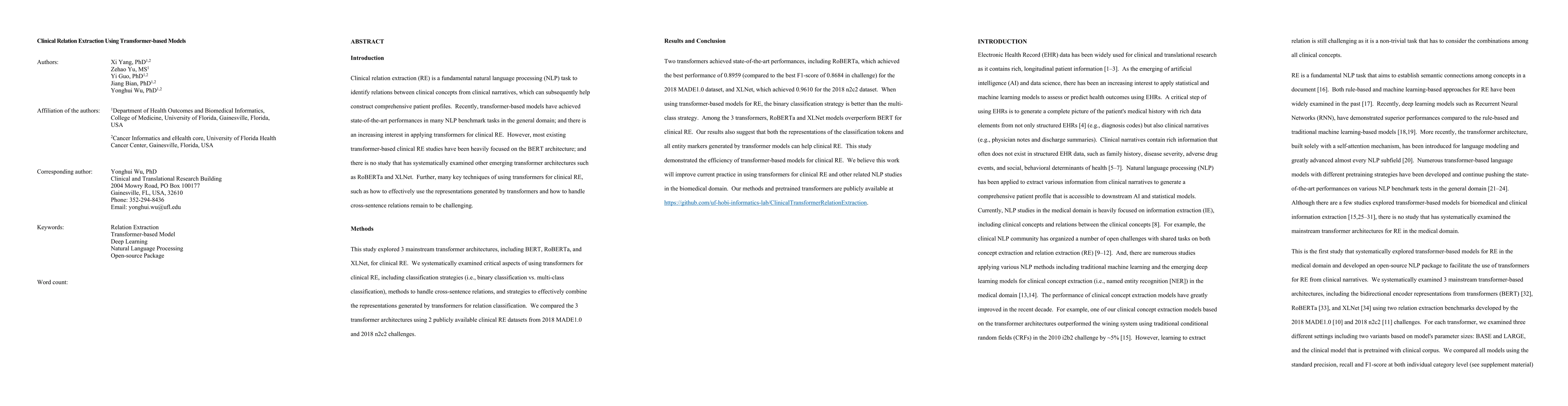 This study explores transformer-based models (BERT, RoBERTa, and XLNet) for clinical relation extraction, achieving state-of-the-art performance on two datasets. The RoBERTa model excelled on the MADE1.0 dataset, while XLNet performed best on the n2c2 dataset, highlighting the effectiveness of binary classification over multi-class.