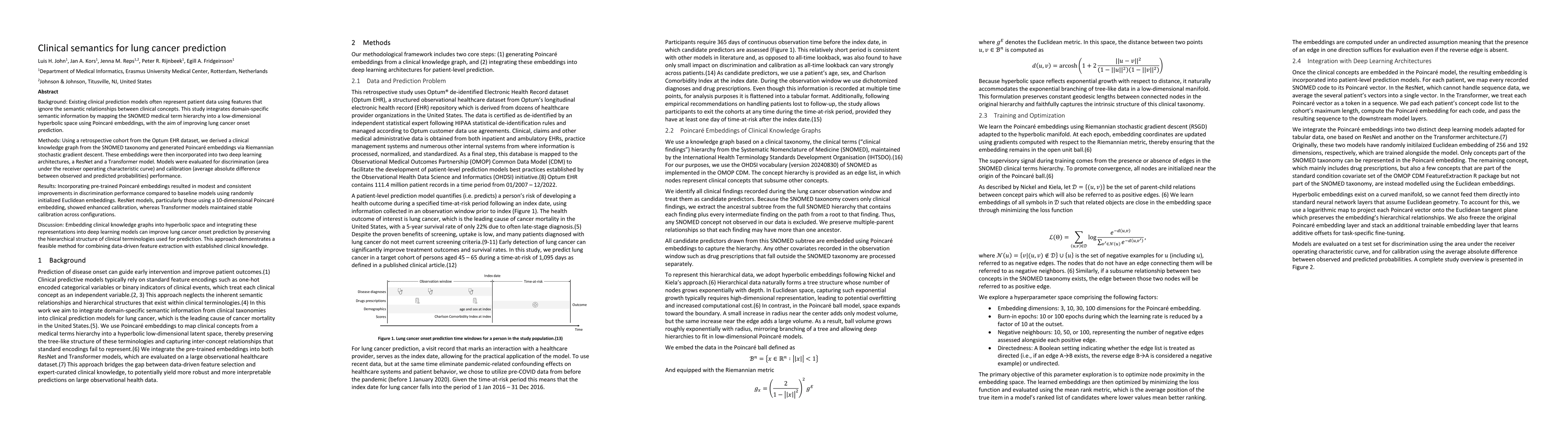 The paper presents a method of embedding clinical knowledge graphs into hyperbolic space and integrating these representations into deep learning models for improved lung cancer onset prediction.