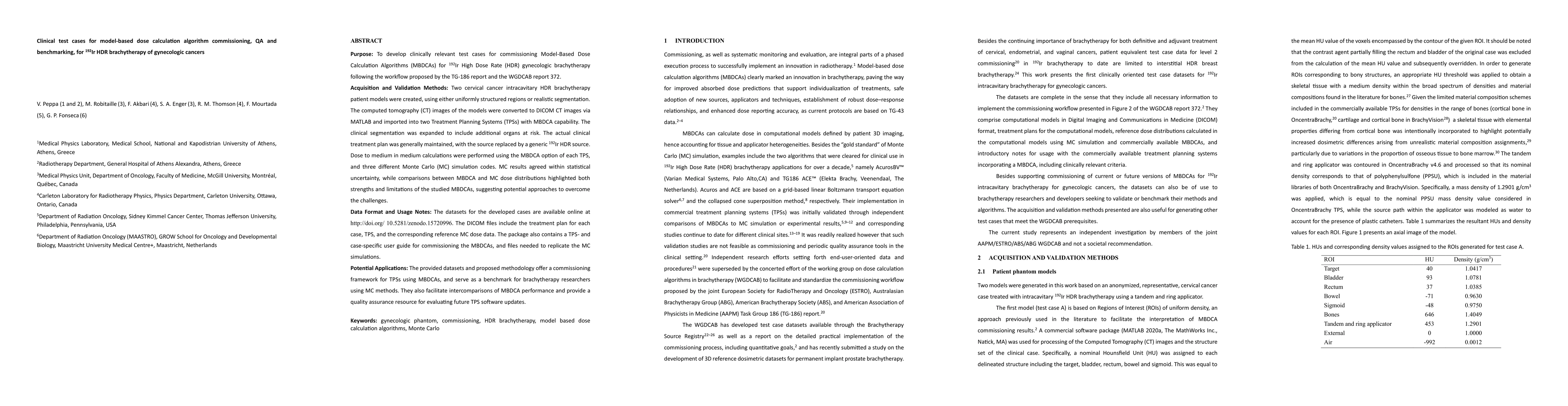 Purpose: To develop clinically relevant test cases for commissioning Model-Based Dose Calculation Algorithms (MBDCAs) for 192Ir High Dose Rate (HDR) gynecologic brachytherapy following the workflow proposed by the TG-186 report and the WGDCAB report 372. Acquisition and Validation Methods: Two cervical cancer intracavitary HDR brachytherapy patient models were created, using either uniformly structured regions or realistic segmentation. The computed tomography (CT) images of the models were converted to DICOM CT images via MATLAB and imported into two Treatment Planning Systems (TPSs) with MBDCA capability. The clinical segmentation was expanded to include additional organs at risk. The actual clinical treatment plan was generally maintained, with the source replaced by a generic 192Ir HDR source. Dose to medium in medium calculations were performed using the MBDCA option of each TPS, and three different Monte Carlo (MC) simulation codes. MC results agreed within statistical uncertainty, while comparisons between MBDCA and MC dose distributions highlighted both strengths and limitations of the studied MBDCAs, suggesting potential approaches to overcome the challenges. Data Format and Usage Notes: The datasets for the developed cases are available online at http://doi.org/ 10.5281/zenodo.15720996. The DICOM files include the treatment plan for each case, TPS, and the corresponding reference MC dose data. The package also contains a TPS- and case-specific user guide for commissioning the MBDCAs, and files needed to replicate the MC simulations. Potential Applications: The provided datasets and proposed methodology offer a commissioning framework for TPSs using MBDCAs, and serve as a benchmark for brachytherapy researchers using MC methods. They also facilitate intercomparisons of MBDCA performance and provide a quality assurance resource for evaluating future TPS software updates.