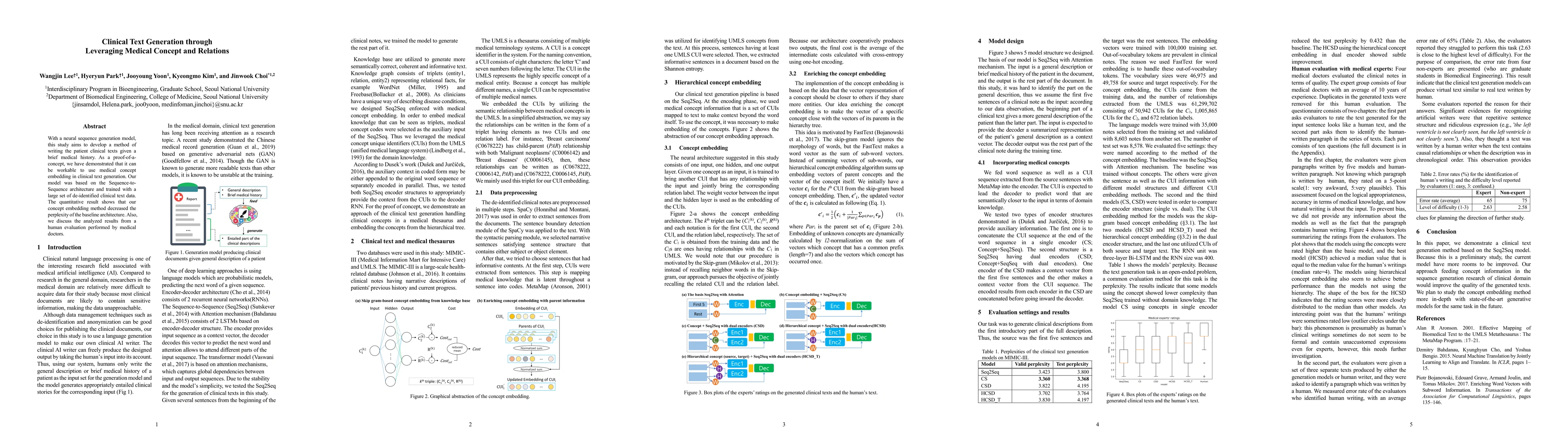 With a neural sequence generation model, this study aims to develop a method of writing the patient clinical texts given a brief medical history. As a proof-of-a-concept, we have demonstrated that it can be workable to use medical concept embedding in clinical text generation. Our model was based on the Sequence-to-Sequence architecture and trained with a large set of de-identified clinical text data. The quantitative result shows that our concept embedding method decreased the perplexity of the baseline architecture. Also, we discuss the analyzed results from a human evaluation performed by medical doctors.