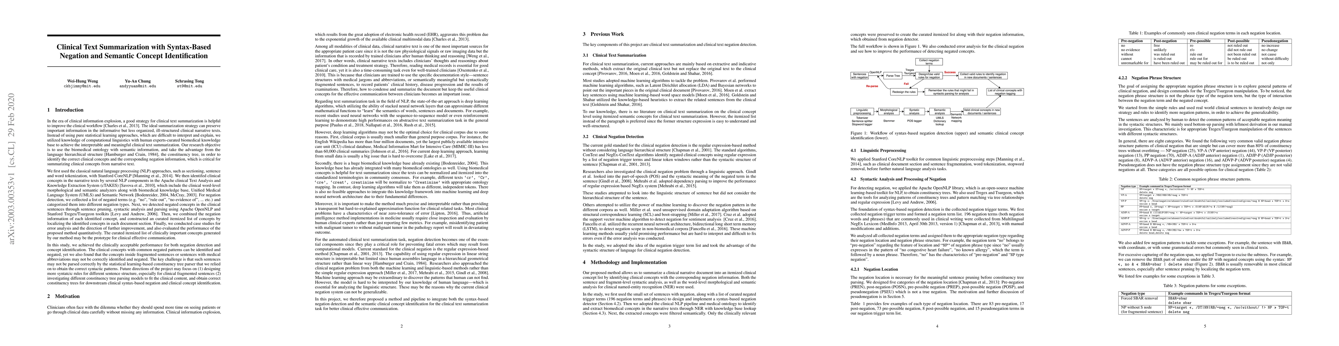 This paper proposes a clinical text summarization method using syntax-based negation detection and semantic concept identification, leveraging a biomedical knowledge base and computational linguistics. The approach achieves interpretable summarization by identifying clinical concepts and their negations from narrative text, demonstrating clinically acceptable performance.