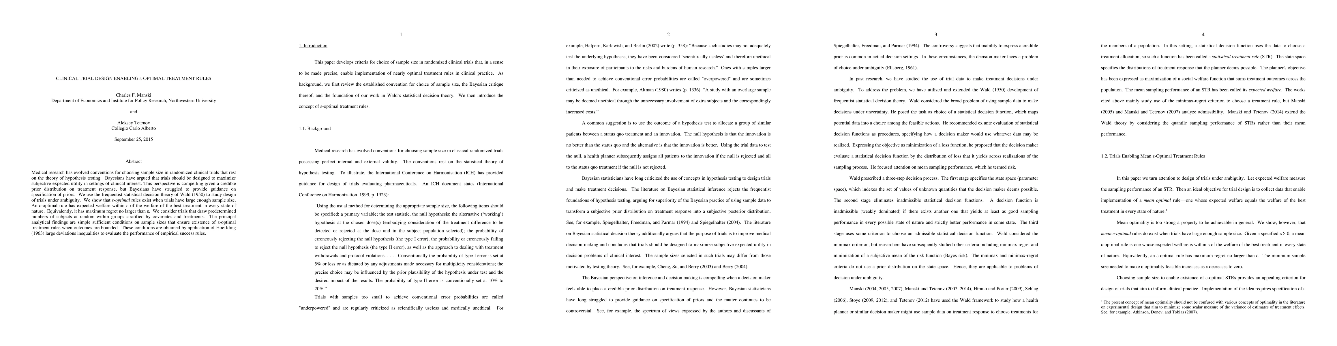 Medical research has evolved conventions for choosing sample size in randomized clinical trials that rest on the theory of hypothesis testing. Bayesians have argued that trials should be designed to maximize subjective expected utility in settings of clinical interest. This perspective is compelling given a credible prior distribution on treatment response, but Bayesians have struggled to provide guidance on specification of priors. We use the frequentist statistical decision theory of Wald (1950) to study design of trials under ambiguity. We show that {\epsilon}-optimal rules exist when trials have large enough sample size. An {\epsilon}-optimal rule has expected welfare within {\epsilon} of the welfare of the best treatment in every state of nature. Equivalently, it has maximum regret no larger than {\epsilon}. We consider trials that draw predetermined numbers of subjects at random within groups stratified by covariates and treatments. The principal analytical findings are simple sufficient conditions on sample sizes that ensure existence of {\epsilon}-optimal treatment rules when outcomes are bounded. These conditions are obtained by application of Hoeffding (1963) large deviations inequalities to evaluate the performance of empirical success rules.