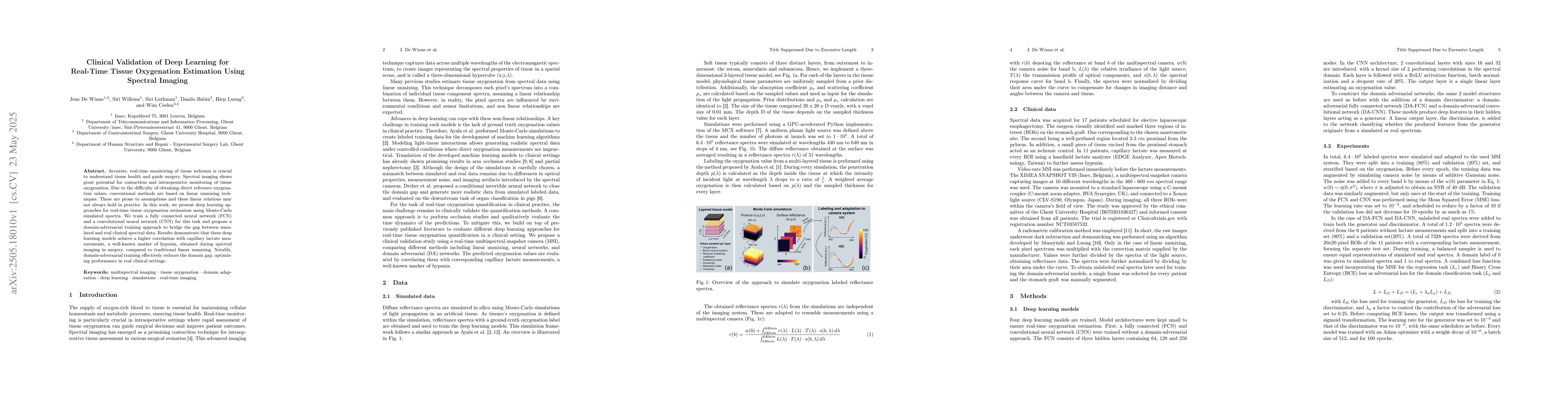 The research employs deep learning models, including fully connected neural networks (FCN), convolutional neural networks (CNN), and domain-adversarial networks (DA-FCN, DA-CNN), for real-time tissue oxygenation estimation using spectral imaging. Monte-Carlo simulated spectra are used for training, and a domain-adversarial training approach is proposed to bridge the gap between simulated and real clinical spectral data.