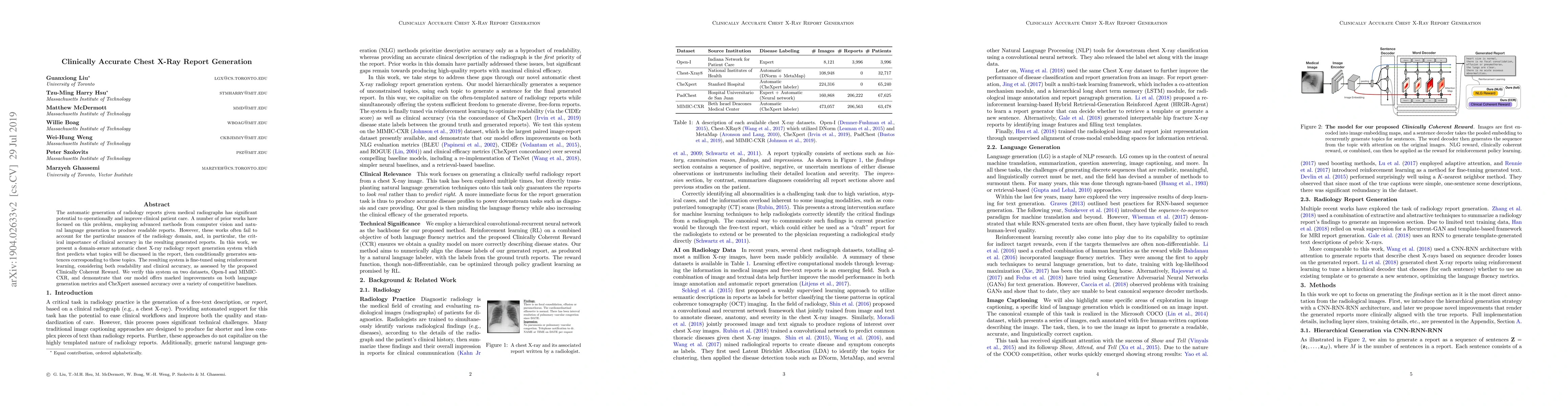 This paper presents a domain-aware system for generating clinically accurate chest X-ray reports, leveraging computer vision and natural language generation. The system is fine-tuned using reinforcement learning to balance readability and clinical accuracy, showing marked improvements over baselines on multiple datasets.