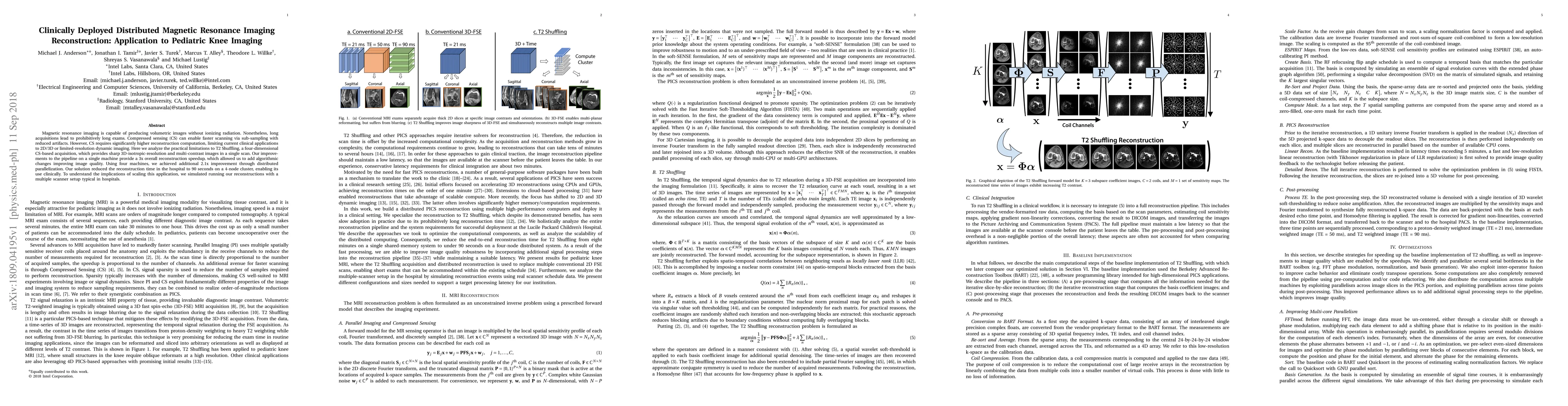 This paper presents a method to significantly speed up the computationally intensive reconstruction process in Compressed Sensing (CS)-based MRI, specifically for T2 Shuffling. By optimizing the reconstruction pipeline on a single machine and utilizing distributed parallelization across four machines, the researchers achieved a 3x speedup initially, then an additional 2.1x with distributed computing. This resulted in a 90-second reconstruction time on a 4-node cluster, making CS-MRI clinically viable for pediatric knee imaging. The study also simulated scaling for multiple scanner hospital setups.