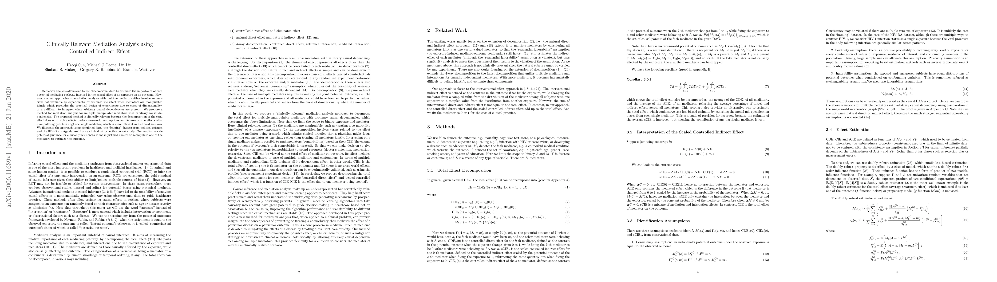 A new method for mediation analysis with multiple manipulable mediators is proposed, allowing clinicians to make informed choices about manipulating a single mediator to optimize outcomes. This approach provides clinically relevant insights without relying on assumptions or arbitrary causal dependencies.