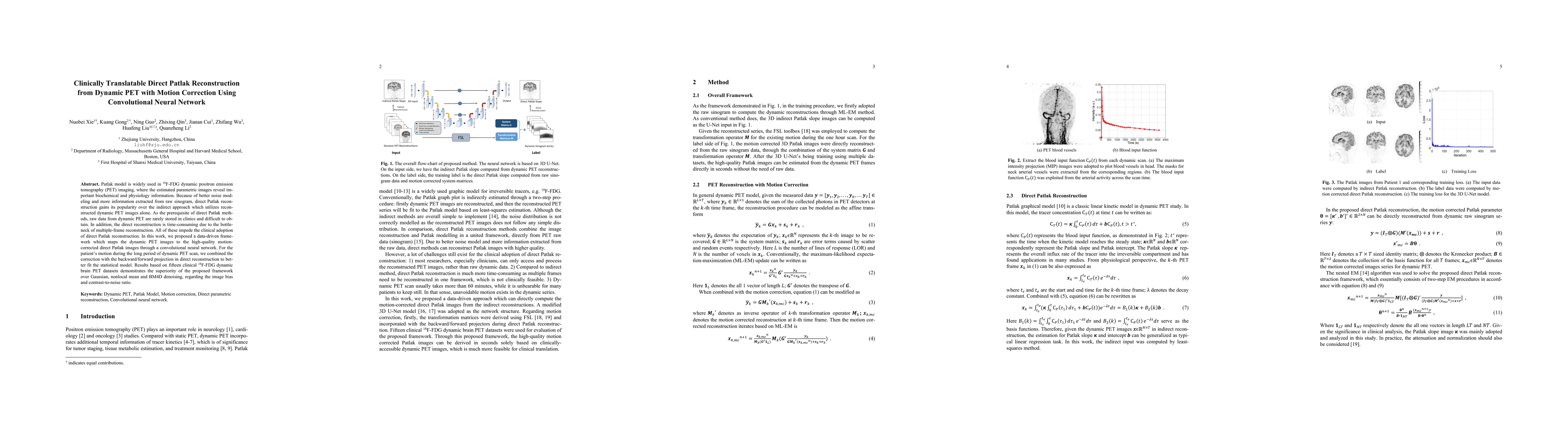 This paper proposes a convolutional neural network framework to map dynamic PET images to high-quality, motion-corrected direct Patlak reconstructions, addressing the clinical challenges of data accessibility and reconstruction time. The method shows superior performance in image bias and contrast-to-noise ratio compared to traditional denoising techniques.