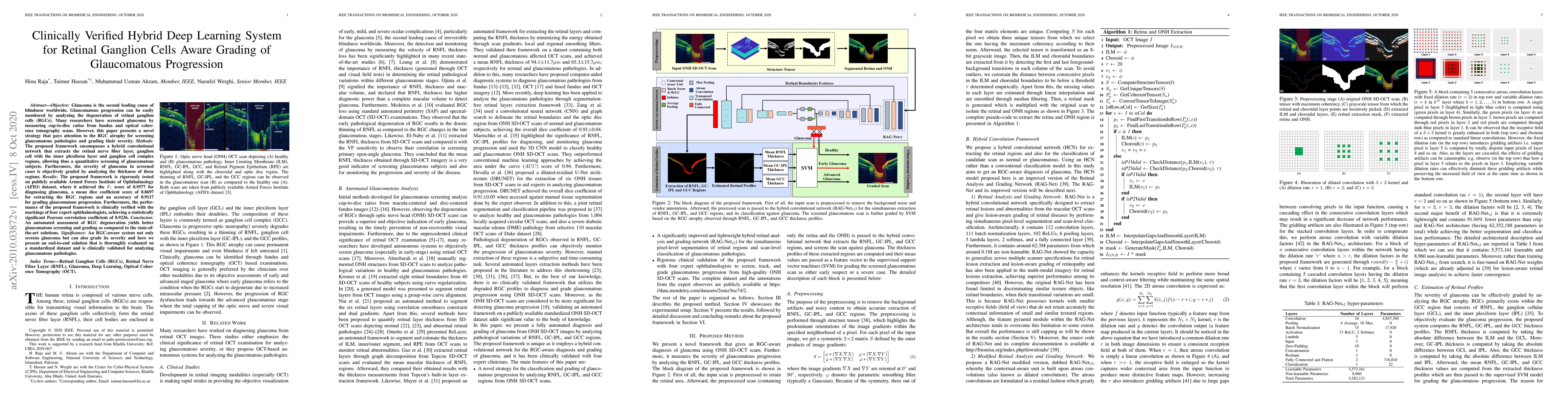 This paper introduces a hybrid deep learning system for grading glaucomatous progression by analyzing retinal ganglion cell (RGC) atrophy, achieving high diagnostic accuracy and correlation with expert ophthalmologists. The system outperforms existing methods by focusing on RGC regions for better glaucoma screening and severity grading.