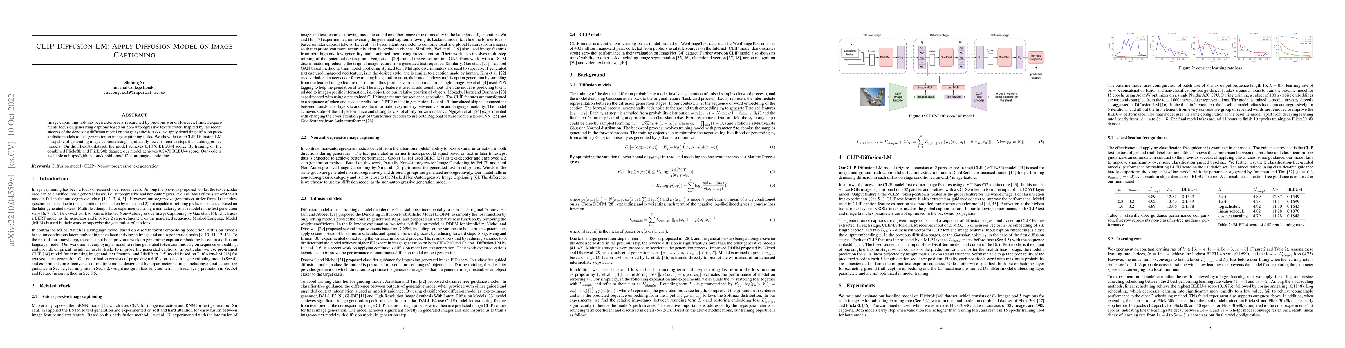 This paper introduces CLIP-Diffusion-LM, a novel approach that applies denoising diffusion probabilistic models to image captioning, achieving captions with fewer inference steps compared to autoregressive models. The method demonstrates improved performance on the Flickr8k dataset, achieving a BLEU-4 score of 0.1876.