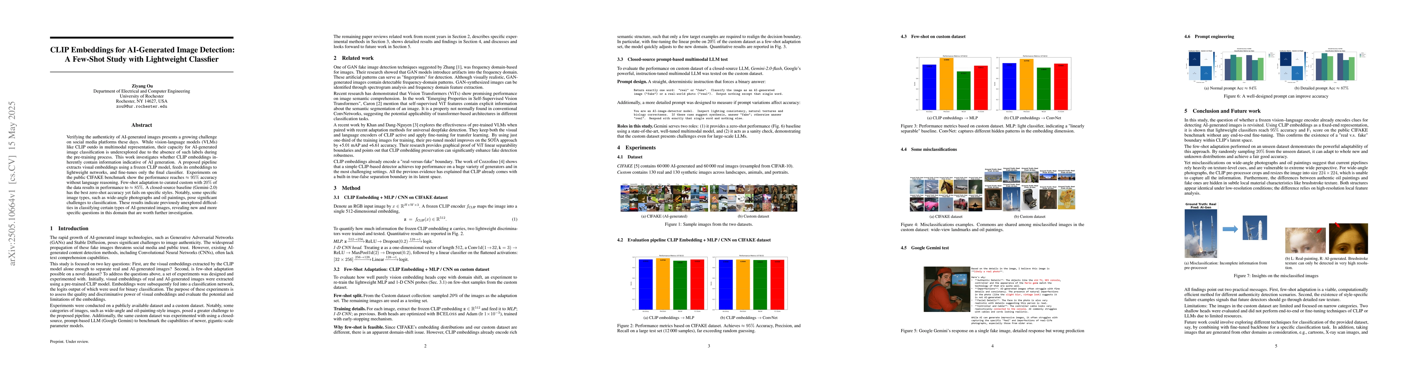 Researchers explored whether CLIP embeddings can detect AI-generated images, finding a 95% accuracy rate on a benchmark without requiring language reasoning. They also discovered difficulties in classifying certain image types, such as wide-angle photographs and oil paintings.