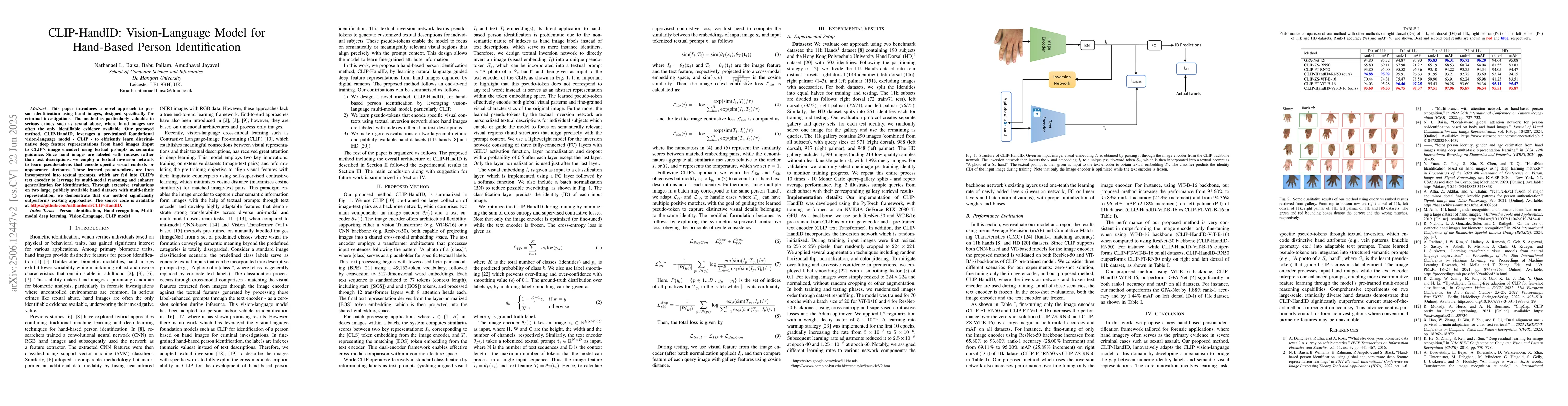 This paper introduces a novel approach to person identification using hand images, designed specifically for criminal investigations. The method is particularly valuable in serious crimes such as sexual abuse, where hand images are often the only identifiable evidence available. Our proposed method, CLIP-HandID, leverages a pre-trained foundational vision-language model - CLIP - to efficiently learn discriminative deep feature representations from hand images (input to CLIP's image encoder) using textual prompts as semantic guidance. Since hand images are labeled with indexes rather than text descriptions, we employ a textual inversion network to learn pseudo-tokens that encode specific visual contexts or appearance attributes. These learned pseudo-tokens are then incorporated into textual prompts, which are fed into CLIP's text encoder to leverage its multi-modal reasoning and enhance generalization for identification. Through extensive evaluations on two large, publicly available hand datasets with multi-ethnic representation, we demonstrate that our method significantly outperforms existing approaches.