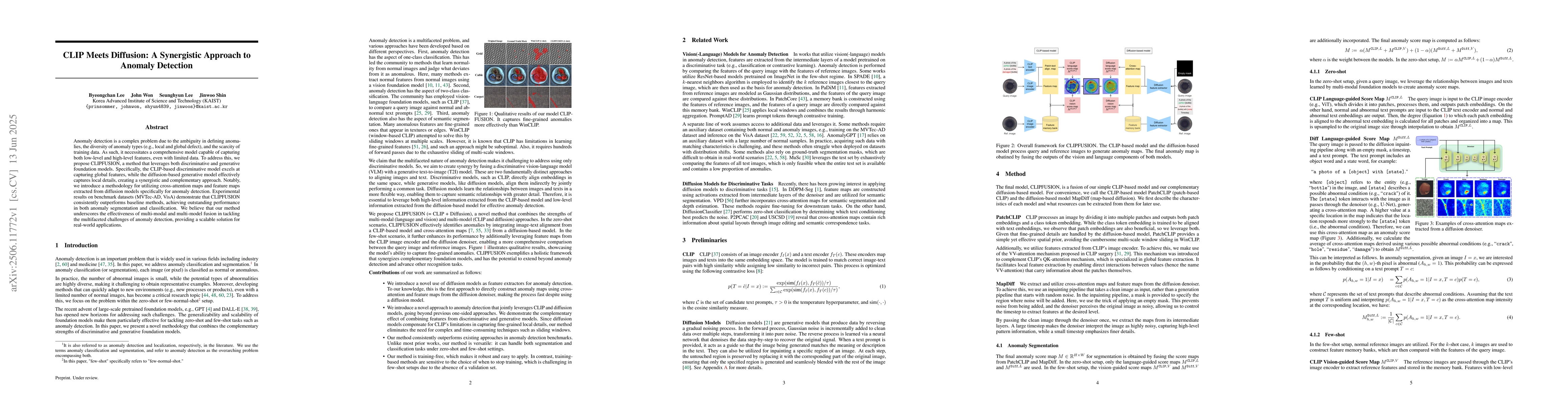 Anomaly detection is a complex problem due to the ambiguity in defining anomalies, the diversity of anomaly types (e.g., local and global defect), and the scarcity of training data. As such, it necessitates a comprehensive model capable of capturing both low-level and high-level features, even with limited data. To address this, we propose CLIPFUSION, a method that leverages both discriminative and generative foundation models. Specifically, the CLIP-based discriminative model excels at capturing global features, while the diffusion-based generative model effectively captures local details, creating a synergistic and complementary approach. Notably, we introduce a methodology for utilizing cross-attention maps and feature maps extracted from diffusion models specifically for anomaly detection. Experimental results on benchmark datasets (MVTec-AD, VisA) demonstrate that CLIPFUSION consistently outperforms baseline methods, achieving outstanding performance in both anomaly segmentation and classification. We believe that our method underscores the effectiveness of multi-modal and multi-model fusion in tackling the multifaceted challenges of anomaly detection, providing a scalable solution for real-world applications.