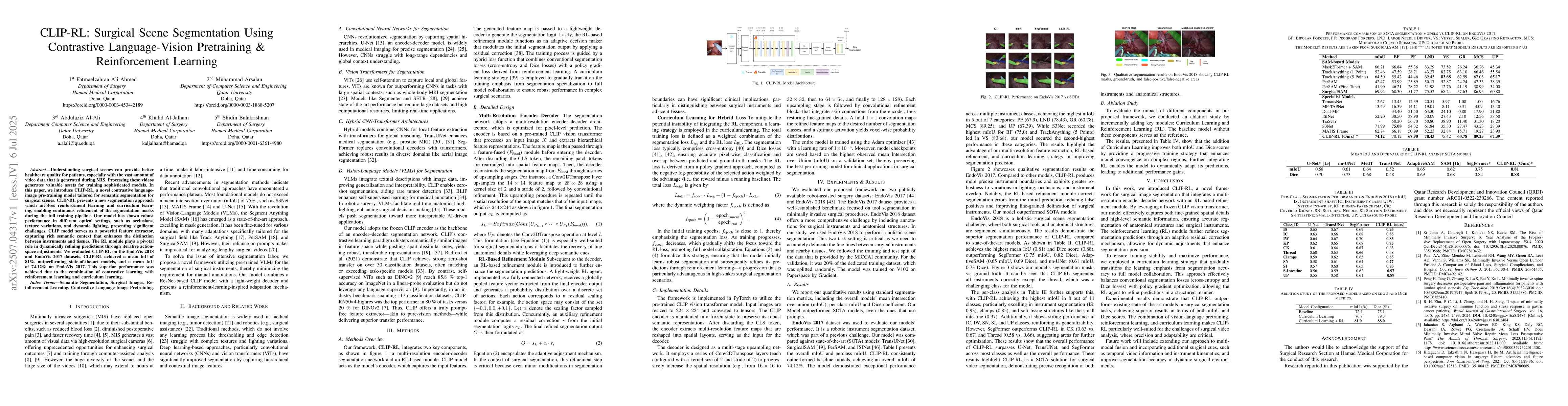 Understanding surgical scenes can provide better healthcare quality for patients, especially with the vast amount of video data that is generated during MIS. Processing these videos generates valuable assets for training sophisticated models. In this paper, we introduce CLIP-RL, a novel contrastive language-image pre-training model tailored for semantic segmentation for surgical scenes. CLIP-RL presents a new segmentation approach which involves reinforcement learning and curriculum learning, enabling continuous refinement of the segmentation masks during the full training pipeline. Our model has shown robust performance in different optical settings, such as occlusions, texture variations, and dynamic lighting, presenting significant challenges. CLIP model serves as a powerful feature extractor, capturing rich semantic context that enhances the distinction between instruments and tissues. The RL module plays a pivotal role in dynamically refining predictions through iterative action-space adjustments. We evaluated CLIP-RL on the EndoVis 2018 and EndoVis 2017 datasets. CLIP-RL achieved a mean IoU of 81%, outperforming state-of-the-art models, and a mean IoU of 74.12% on EndoVis 2017. This superior performance was achieved due to the combination of contrastive learning with reinforcement learning and curriculum learning.