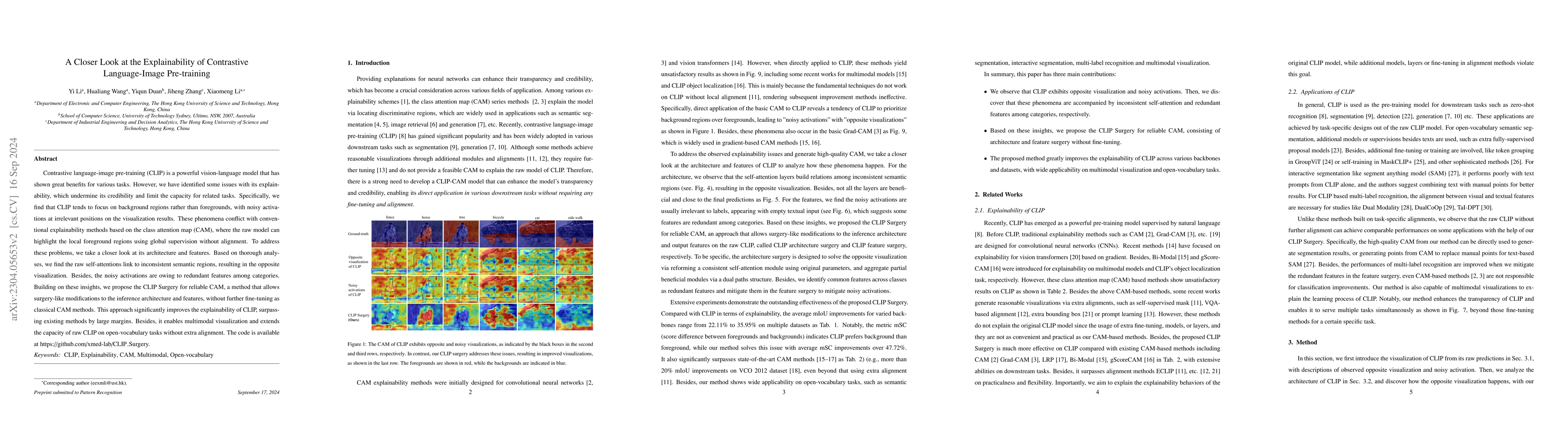 Contrastive Language-Image Pre-training (CLIP) is a powerful multimodal large vision model that has demonstrated significant benefits for downstream tasks, including many zero-shot learning and text-guided vision tasks. However, we notice some severe problems regarding the model's explainability, which undermines its credibility and impedes related tasks. Specifically, we find CLIP prefers the background regions than the foregrounds according to the predicted similarity map, which contradicts human understanding. Besides, there are obvious noisy activations on the visualization results at irrelevant positions. To address these two issues, we conduct in-depth analyses and reveal the reasons with new findings and evidences. Based on these insights, we propose the CLIP Surgery, a method that enables surgery-like modifications for the inference architecture and features, for better explainability and enhancement in multiple open-vocabulary tasks. The proposed method has significantly improved the explainability of CLIP for both convolutional networks and vision transformers, surpassing existing methods by large margins. Besides, our approach also demonstrates remarkable improvements in open-vocabulary segmentation and multi-label recognition tasks. For examples, the mAP improvement on NUS-Wide multi-label recognition is 4.41% without any additional training, and our CLIP Surgery surpasses the state-of-the-art method by 8.74% at mIoU on Cityscapes open-vocabulary semantic segmentation. Furthermore, our method benefits other tasks including multimodal visualization and interactive segmentation like Segment Anything Model (SAM). The code is available at https://github.com/xmed-lab/CLIP_Surgery