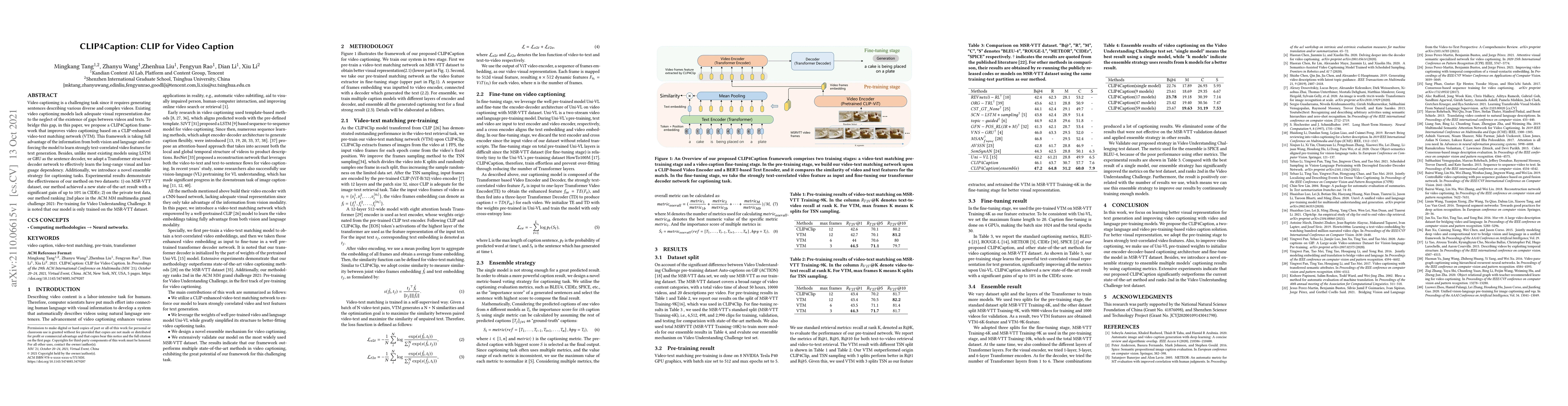 Video captioning is a challenging task since it requires generating sentences describing various diverse and complex videos. Existing video captioning models lack adequate visual representation due to the neglect of the existence of gaps between videos and texts. To bridge this gap, in this paper, we propose a CLIP4Caption framework that improves video captioning based on a CLIP-enhanced video-text matching network (VTM). This framework is taking full advantage of the information from both vision and language and enforcing the model to learn strongly text-correlated video features for text generation. Besides, unlike most existing models using LSTM or GRU as the sentence decoder, we adopt a Transformer structured decoder network to effectively learn the long-range visual and language dependency. Additionally, we introduce a novel ensemble strategy for captioning tasks. Experimental results demonstrate the effectiveness of our method on two datasets: 1) on MSR-VTT dataset, our method achieved a new state-of-the-art result with a significant gain of up to 10% in CIDEr; 2) on the private test data, our method ranking 2nd place in the ACM MM multimedia grand challenge 2021: Pre-training for Video Understanding Challenge. It is noted that our model is only trained on the MSR-VTT dataset.