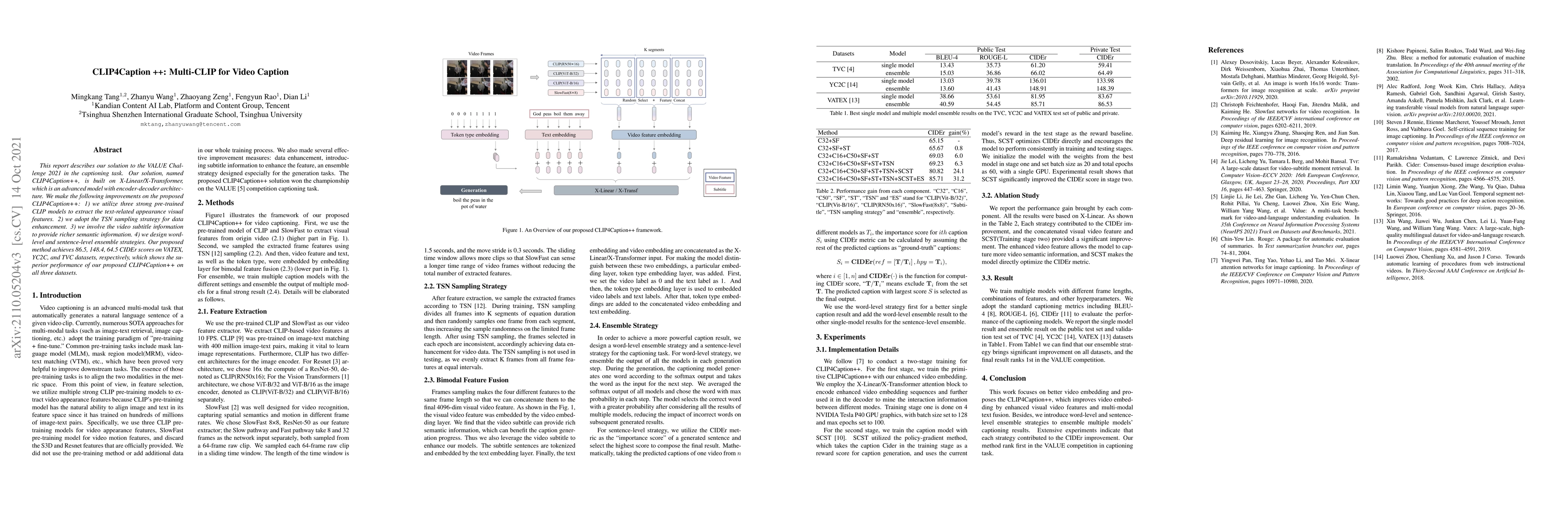 The research paper presents CLIP4Caption++, an enhanced video captioning model built on X-Transformer architecture. It leverages three pre-trained CLIP models for visual feature extraction, TSN sampling for data enhancement, and incorporates video subtitle information for richer semantic context. The model also employs word-level and sentence-level ensemble strategies, achieving high CIDEr scores on VATEX, YC2C, and TVC datasets, demonstrating superior performance.