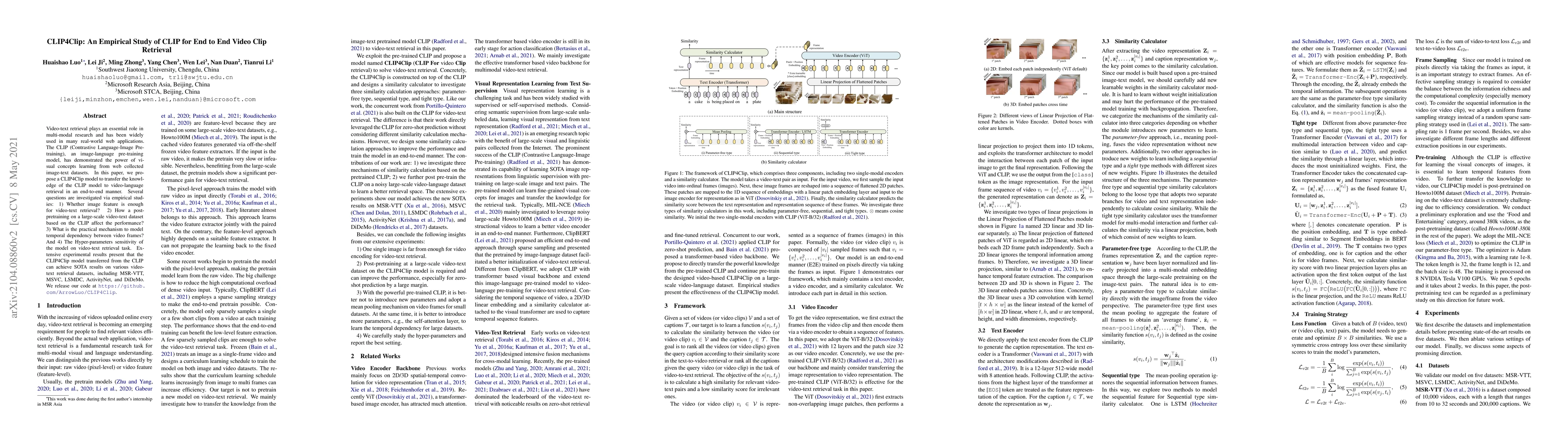 This paper proposes CLIP4Clip, a model that leverages the CLIP framework for end-to-end video clip retrieval. The study investigates the effectiveness of image features for video-text retrieval, the impact of post-training on video-text datasets, and the modeling of temporal dependencies in videos, achieving state-of-the-art results on multiple datasets.