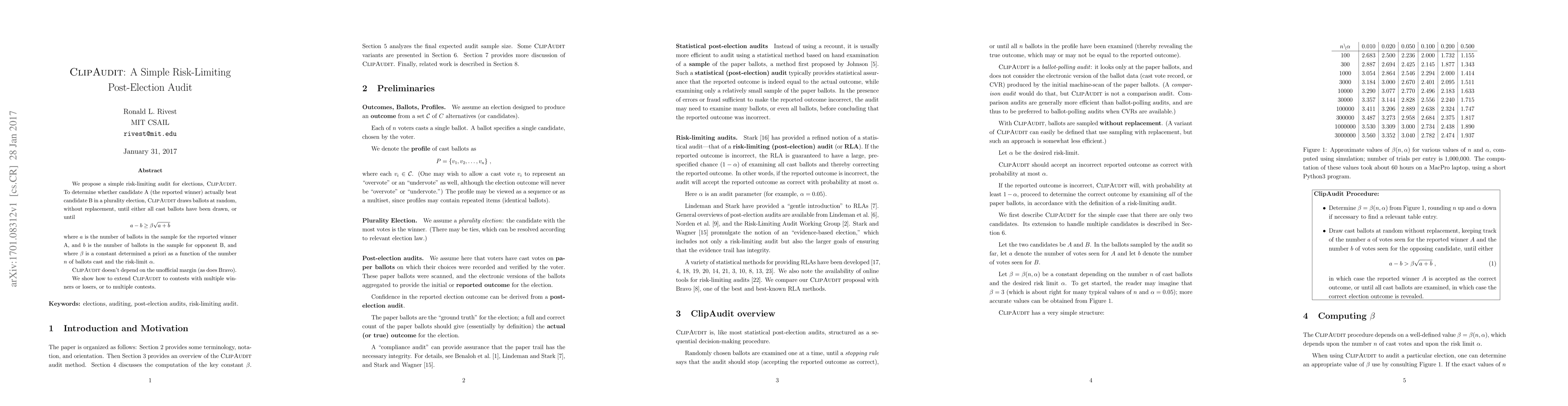 ClipAudit is a straightforward risk-limiting audit method for verifying election results, ensuring that the reported winner actually won with a high degree of confidence. It randomly samples ballots until a statistical threshold is met, without relying on the unofficial margin.