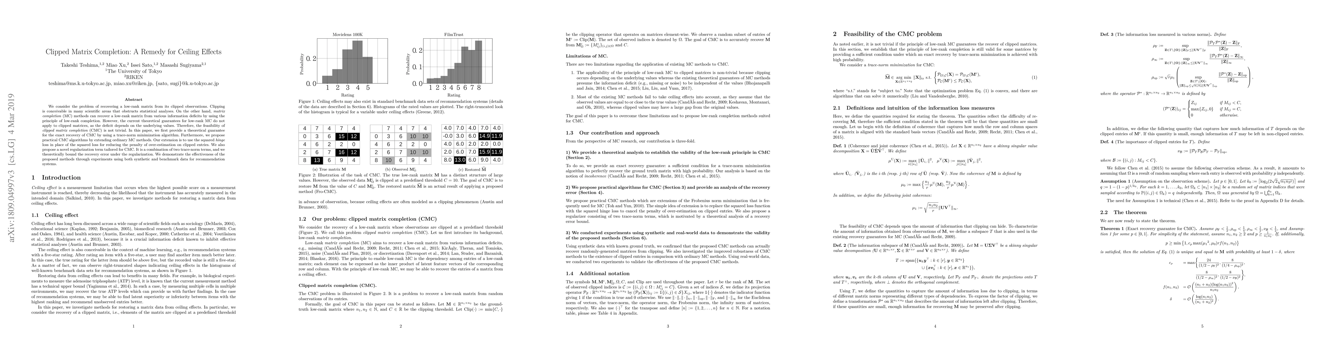 We consider the problem of recovering a low-rank matrix from its clipped observations. Clipping is conceivable in many scientific areas that obstructs statistical analyses. On the other hand, matrix completion (MC) methods can recover a low-rank matrix from various information deficits by using the principle of low-rank completion. However, the current theoretical guarantees for low-rank MC do not apply to clipped matrices, as the deficit depends on the underlying values. Therefore, the feasibility of clipped matrix completion (CMC) is not trivial. In this paper, we first provide a theoretical guarantee for the exact recovery of CMC by using a trace-norm minimization algorithm. Furthermore, we propose practical CMC algorithms by extending ordinary MC methods. Our extension is to use the squared hinge loss in place of the squared loss for reducing the penalty of over-estimation on clipped entries. We also propose a novel regularization term tailored for CMC. It is a combination of two trace-norm terms, and we theoretically bound the recovery error under the regularization. We demonstrate the effectiveness of the proposed methods through experiments using both synthetic and benchmark data for recommendation systems.