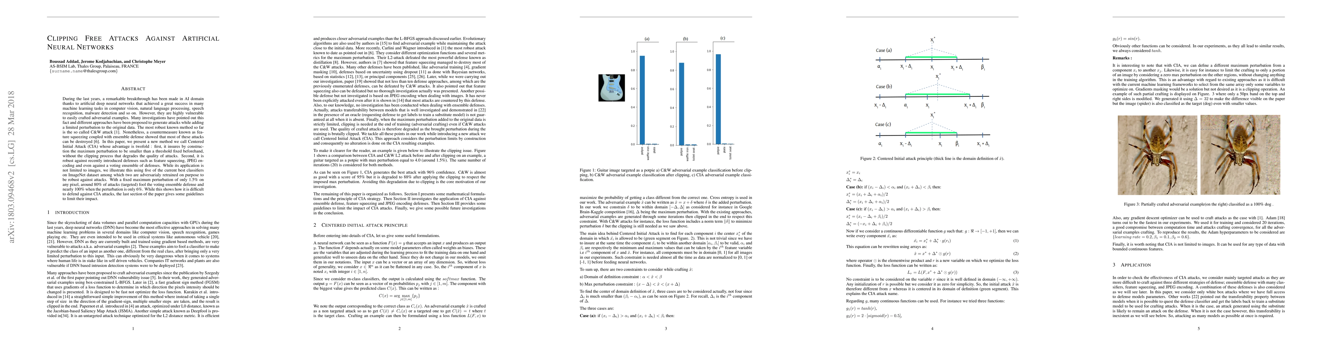 This paper introduces the Centered Initial Attack (CIA), a novel clipping-free adversarial attack method against deep neural networks that ensures minimal perturbation without clipping, and remains effective against various defenses including feature squeezing and ensemble defenses. Despite its small maximum perturbation, CIA achieves high success rates in fooling robust classifiers, highlighting the ongoing challenge in defending against such attacks.