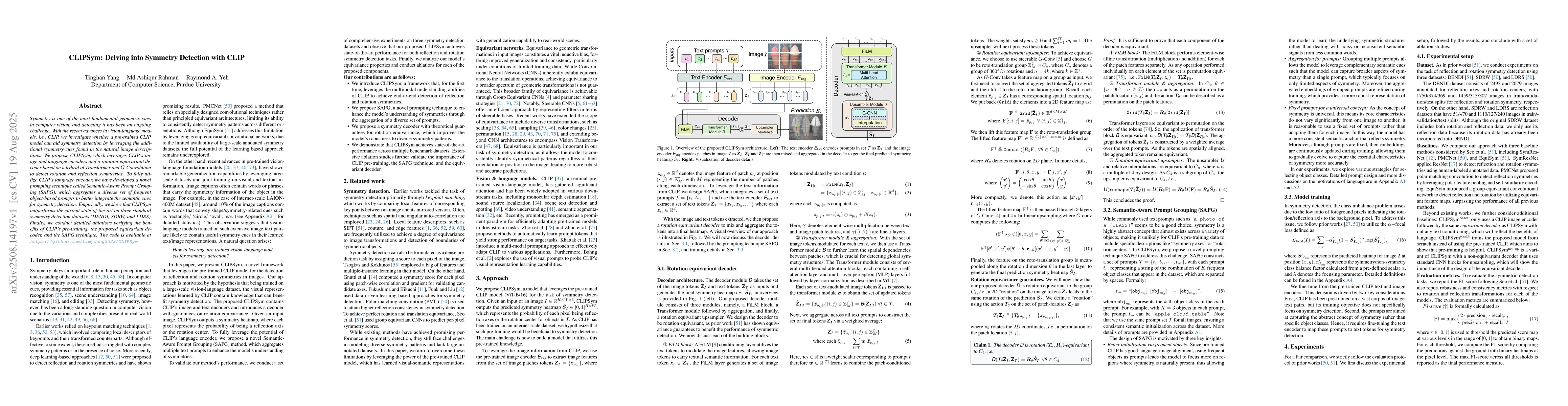 CLIPSym introduces a novel symmetry detection method that utilizes a pre-trained CLIP model, a rotation-equivariant decoder based on a hybrid of Transformer and G-Convolution, and a novel prompting technique called Semantic-Aware Prompt Grouping (SAPG) to effectively integrate semantic cues for symmetry detection.