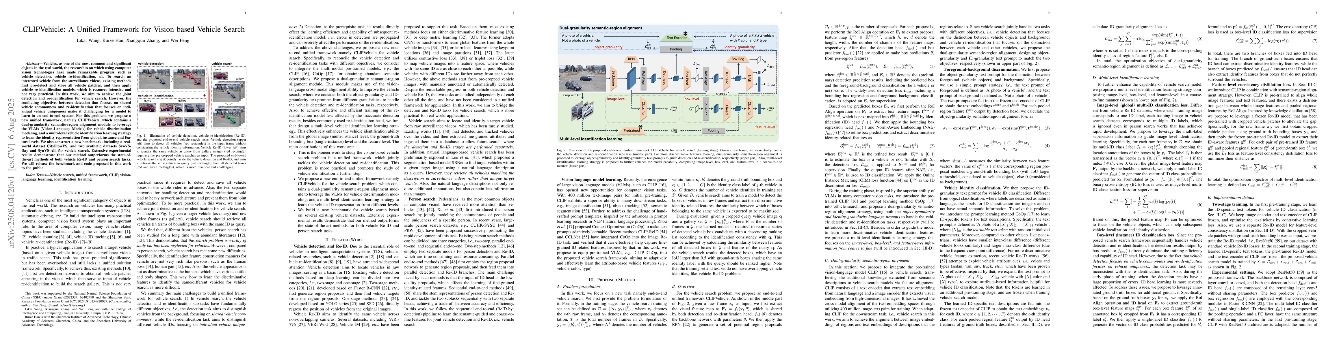 Vehicles, as one of the most common and significant objects in the real world, the researches on which using computer vision technologies have made remarkable progress, such as vehicle detection, vehicle re-identification, etc. To search an interested vehicle from the surveillance videos, existing methods first pre-detect and store all vehicle patches, and then apply vehicle re-identification models, which is resource-intensive and not very practical. In this work, we aim to achieve the joint detection and re-identification for vehicle search. However, the conflicting objectives between detection that focuses on shared vehicle commonness and re-identification that focuses on individual vehicle uniqueness make it challenging for a model to learn in an end-to-end system. For this problem, we propose a new unified framework, namely CLIPVehicle, which contains a dual-granularity semantic-region alignment module to leverage the VLMs (Vision-Language Models) for vehicle discrimination modeling, and a multi-level vehicle identification learning strategy to learn the identity representation from global, instance and feature levels. We also construct a new benchmark, including a real-world dataset CityFlowVS, and two synthetic datasets SynVS-Day and SynVS-All, for vehicle search. Extensive experimental results demonstrate that our method outperforms the state-of-the-art methods of both vehicle Re-ID and person search tasks.