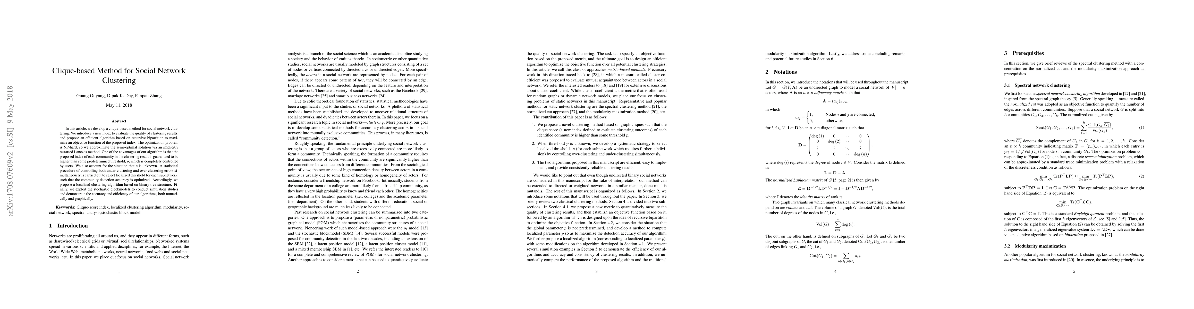 This paper presents a clique-based method for clustering social networks, introducing a new quality index and an efficient recursive bipartition algorithm to maximize it. The proposed method ensures community indices exceed a user-defined threshold, optimizing community detection accuracy through localized clustering and statistical error control.