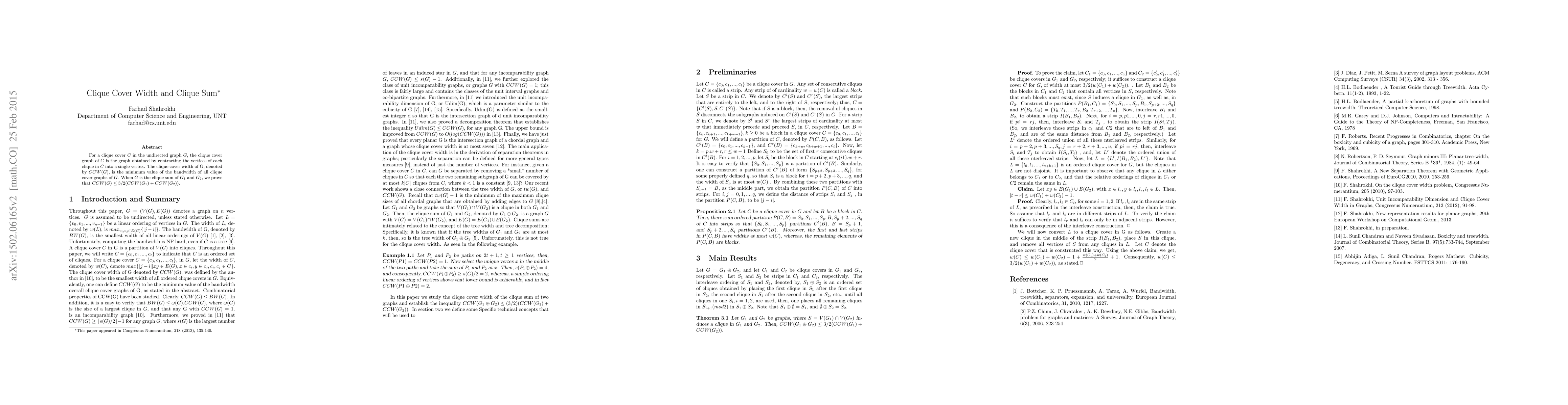 The paper explores the concept of clique cover width ($CCW$) in graphs, defined as the minimum bandwidth of clique cover graphs. It proves an upper bound for $CCW$ in the clique sum of two graphs, showing that $CCW(G) \le 3/2(CCW(G_1) + CCW(G_2))$.