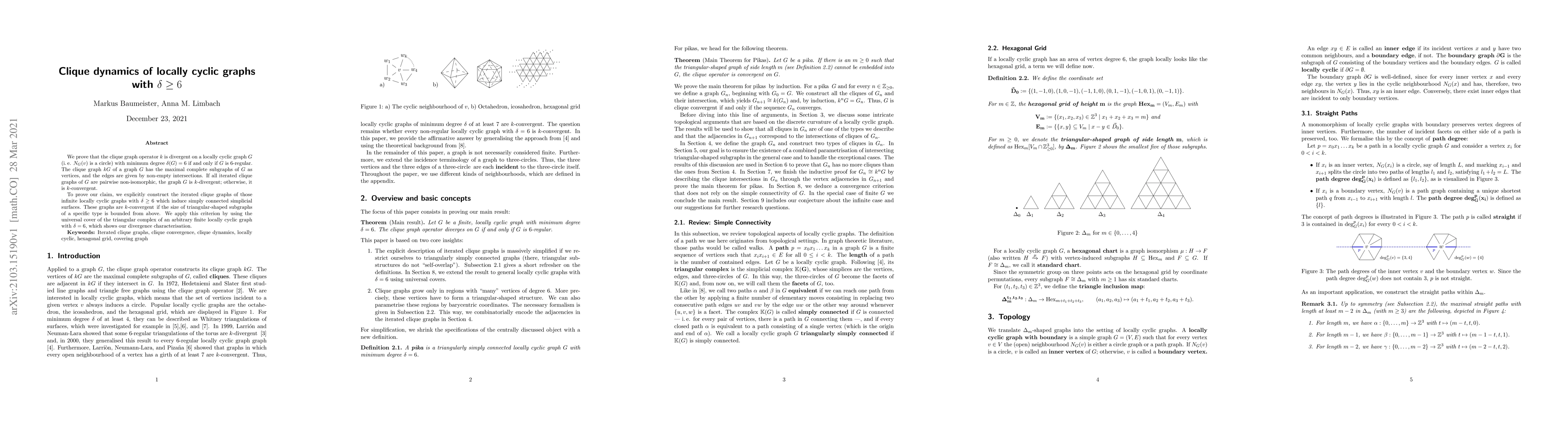 We prove that the clique graph operator $k$ is divergent on a locally cyclic graph $G$ (i.e. $N_G(v)$ is a circle) with minimum degree $\delta(G)=6$ if and only if $G$ is $6$-regular. The clique graph $kG$ of a graph $G$ has the maximal complete subgraphs of $G$ as vertices, and the edges are given by non-empty intersections. If all iterated clique graphs of $G$ are pairwise non-isomorphic, the graph $G$ is $k$-divergent; otherwise, it is $k$-convergent. To prove our claim, we explicitly construct the iterated clique graphs of those infinite locally cyclic graphs with $\delta\geq6$ which induce simply connected simplicial surfaces. These graphs are $k$-convergent if the size of triangular-shaped subgraphs of a specific type is bounded from above. We apply this criterion by using the universal cover of the triangular complex of an arbitrary finite locally cyclic graph with $\delta=6$, which shows our divergence characterisation.