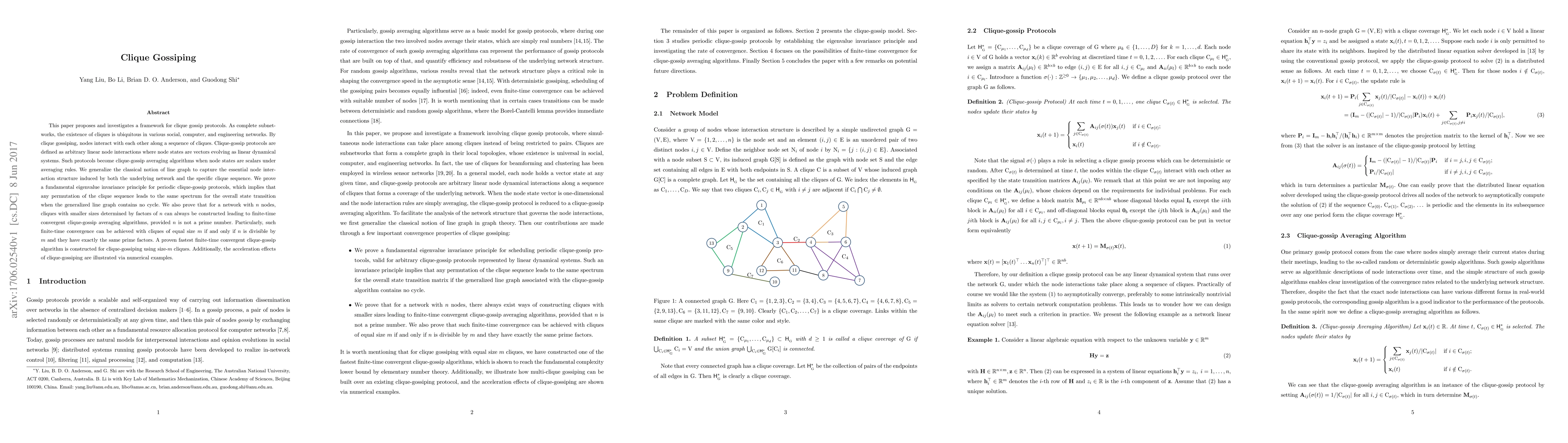 This paper proposes and investigates a framework for clique gossip protocols. As complete subnetworks, the existence of cliques is ubiquitous in various social, computer, and engineering networks. By clique gossiping, nodes interact with each other along a sequence of cliques. Clique-gossip protocols are defined as arbitrary linear node interactions where node states are vectors evolving as linear dynamical systems. Such protocols become clique-gossip averaging algorithms when node states are scalars under averaging rules. We generalize the classical notion of line graph to capture the essential node interaction structure induced by both the underlying network and the specific clique sequence. We prove a fundamental eigenvalue invariance principle for periodic clique-gossip protocols, which implies that any permutation of the clique sequence leads to the same spectrum for the overall state transition when the generalized line graph contains no cycle. We also prove that for a network with $n$ nodes, cliques with smaller sizes determined by factors of $n$ can always be constructed leading to finite-time convergent clique-gossip averaging algorithms, provided $n$ is not a prime number. Particularly, such finite-time convergence can be achieved with cliques of equal size $m$ if and only if $n$ is divisible by $m$ and they have exactly the same prime factors. A proven fastest finite-time convergent clique-gossip algorithm is constructed for clique-gossiping using size-$m$ cliques. Additionally, the acceleration effects of clique-gossiping are illustrated via numerical examples.