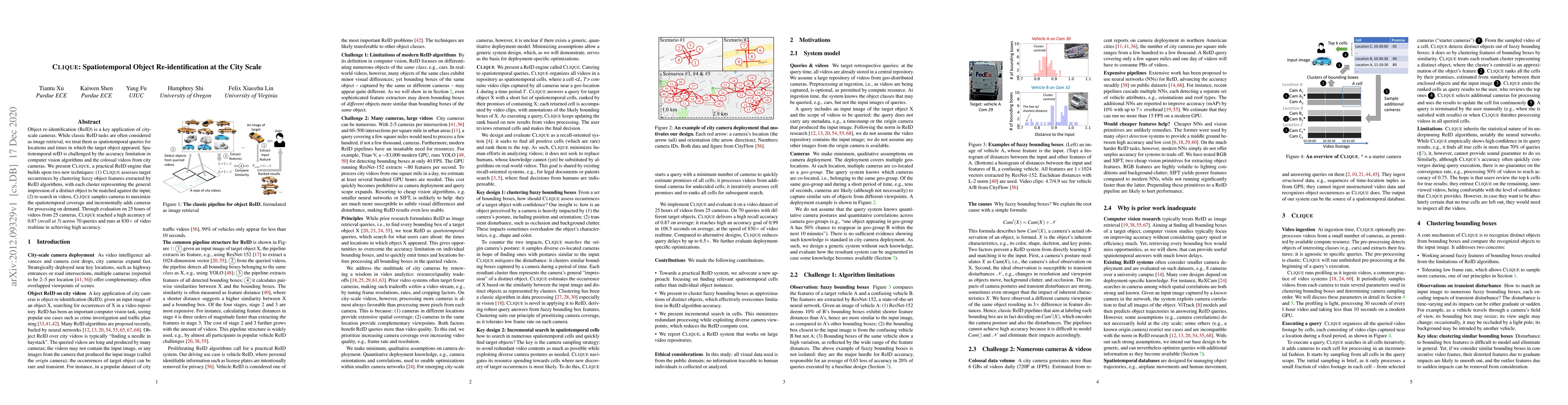 Clique introduces a novel spatiotemporal object re-identification engine that clusters fuzzy object features for accurate matching and samples cameras to maximize coverage, achieving high accuracy and real-time performance on city-scale video data.