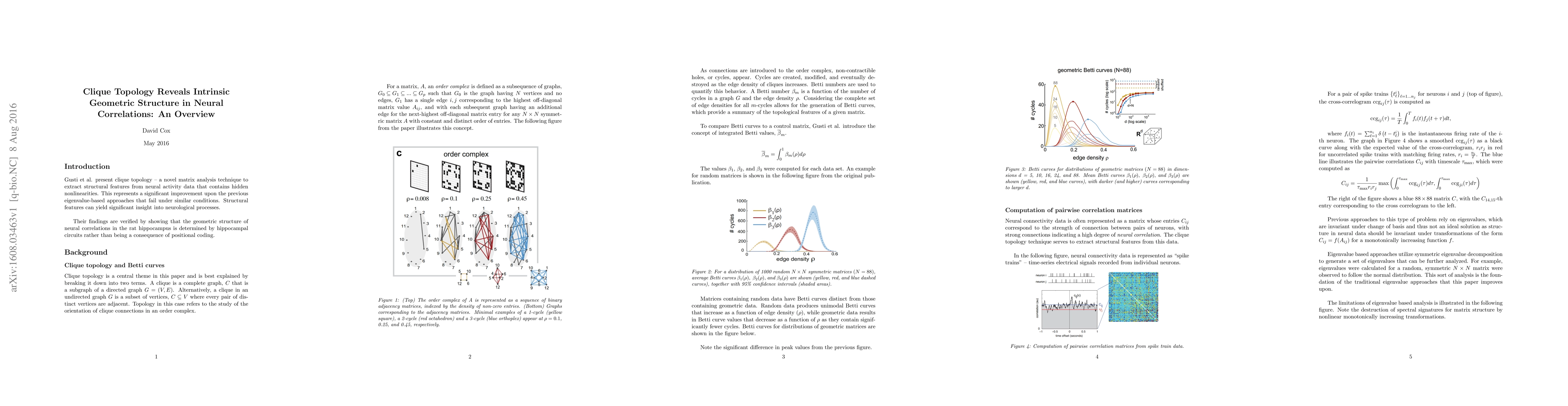 This publication serves as an overview of clique topology -- a novel matrix analysis technique used to extract structural features from neural activity data that contains hidden nonlinearities. We highlight work done by Gusti et al. which introduces clique topology and verifies its applicability to neural feature extraction by showing that neural correlations in the rat hippocampus are determined by geometric structure of hippocampal circuits, rather than being a consequence of positional coding.