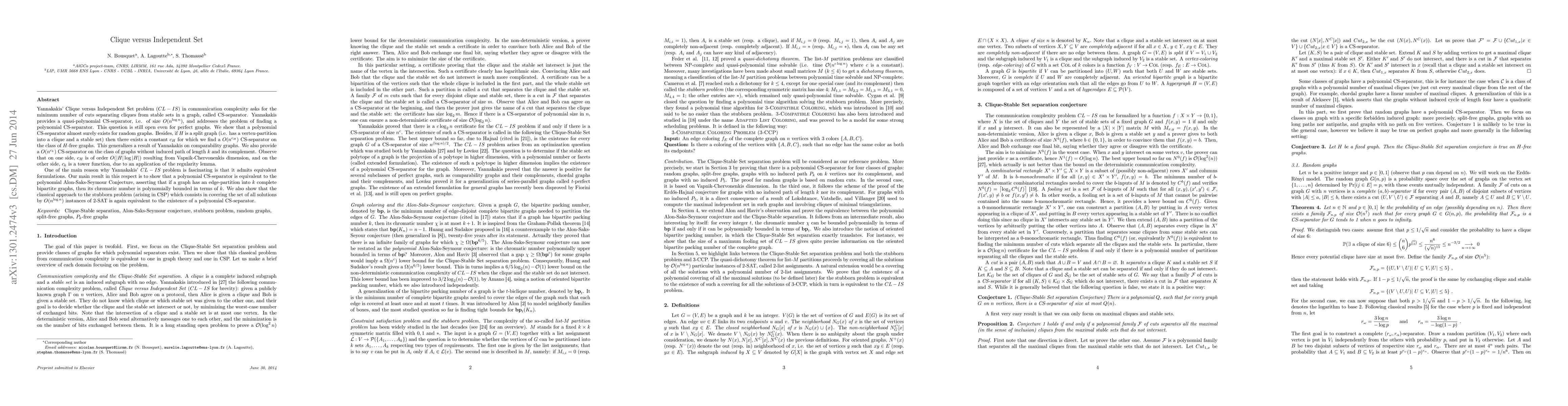 Yannakakis' Clique versus Independent Set problem (CL-IS) in communication complexity asks for the minimum number of cuts separating cliques from stable sets in a graph, called CS-separator. Yannakakis provides a quasi-polynomial CS-separator, i.e. of size $O(n^{\log n})$, and addresses the problem of finding a polynomial CS-separator. This question is still open even for perfect graphs. We show that a polynomial CS-separator almost surely exists for random graphs. Besides, if H is a split graph (i.e. has a vertex-partition into a clique and a stable set) then there exists a constant $c_H$ for which we find a $O(n^{c_H})$ CS-separator on the class of H-free graphs. This generalizes a result of Yannakakis on comparability graphs. We also provide a $O(n^{c_k})$ CS-separator on the class of graphs without induced path of length k and its complement. Observe that on one side, $c_H$ is of order $O(|H| \log |H|)$ resulting from Vapnik-Chervonenkis dimension, and on the other side, $c_k$ is exponential. One of the main reason why Yannakakis' CL-IS problem is fascinating is that it admits equivalent formulations. Our main result in this respect is to show that a polynomial CS-separator is equivalent to the polynomial Alon-Saks-Seymour Conjecture, asserting that if a graph has an edge-partition into k complete bipartite graphs, then its chromatic number is polynomially bounded in terms of k. We also show that the classical approach to the stubborn problem (arising in CSP) which consists in covering the set of all solutions by $O(n^{\log n})$ instances of 2-SAT is again equivalent to the existence of a polynomial CS-separator.