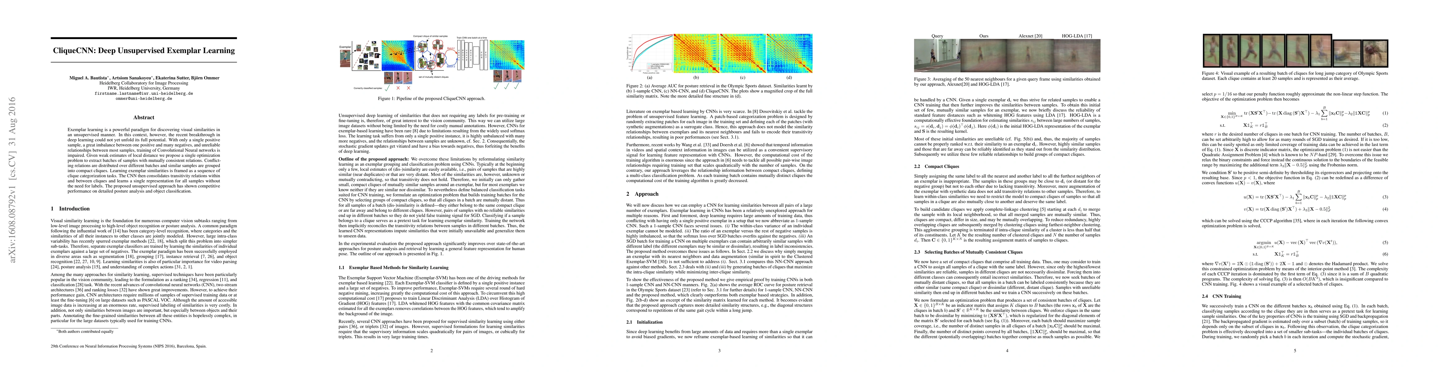Exemplar learning is a powerful paradigm for discovering visual similarities in an unsupervised manner. In this context, however, the recent breakthrough in deep learning could not yet unfold its full potential. With only a single positive sample, a great imbalance between one positive and many negatives, and unreliable relationships between most samples, training of Convolutional Neural networks is impaired. Given weak estimates of local distance we propose a single optimization problem to extract batches of samples with mutually consistent relations. Conflicting relations are distributed over different batches and similar samples are grouped into compact cliques. Learning exemplar similarities is framed as a sequence of clique categorization tasks. The CNN then consolidates transitivity relations within and between cliques and learns a single representation for all samples without the need for labels. The proposed unsupervised approach has shown competitive performance on detailed posture analysis and object classification.