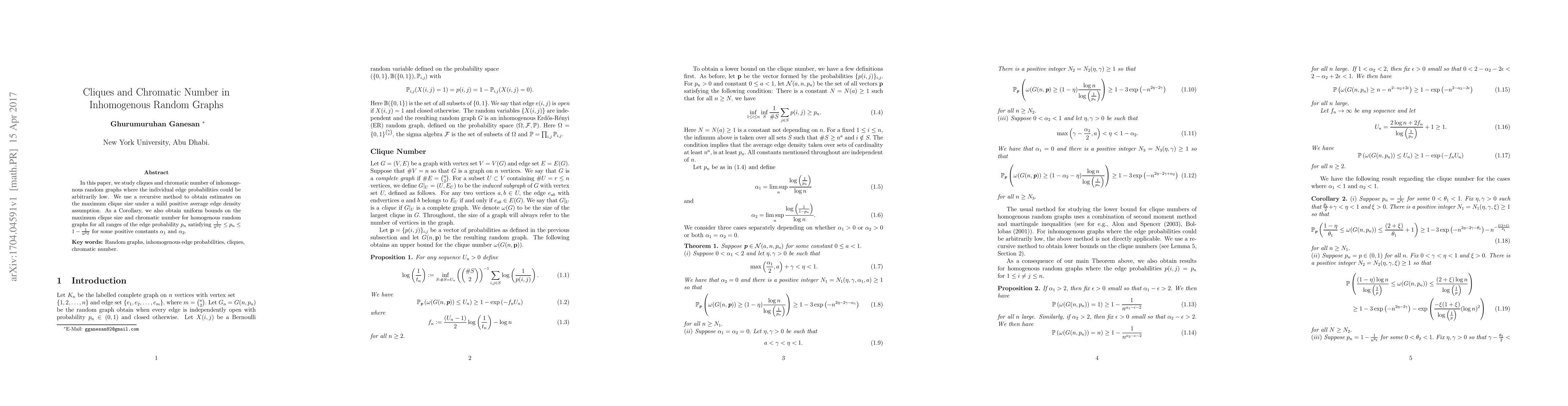 In this paper, we study cliques and chromatic number of inhomogenous random graphs where the individual edge probabilities could be arbitrarily low. We use a recursive method to obtain estimates on the maximum clique size under a mild positive average edge density assumption. As a Corollary, we also obtain uniform bounds on the maximum clique size and chromatic number for homogenous random graphs for all ranges of the edge probability $p_n$ satisfying $\frac{1}{n^{\alpha_1}} \leq p_n \leq 1-\frac{1}{n^{\alpha_2}}$ for some positive constants $\alpha_1$ and $\alpha_2$.