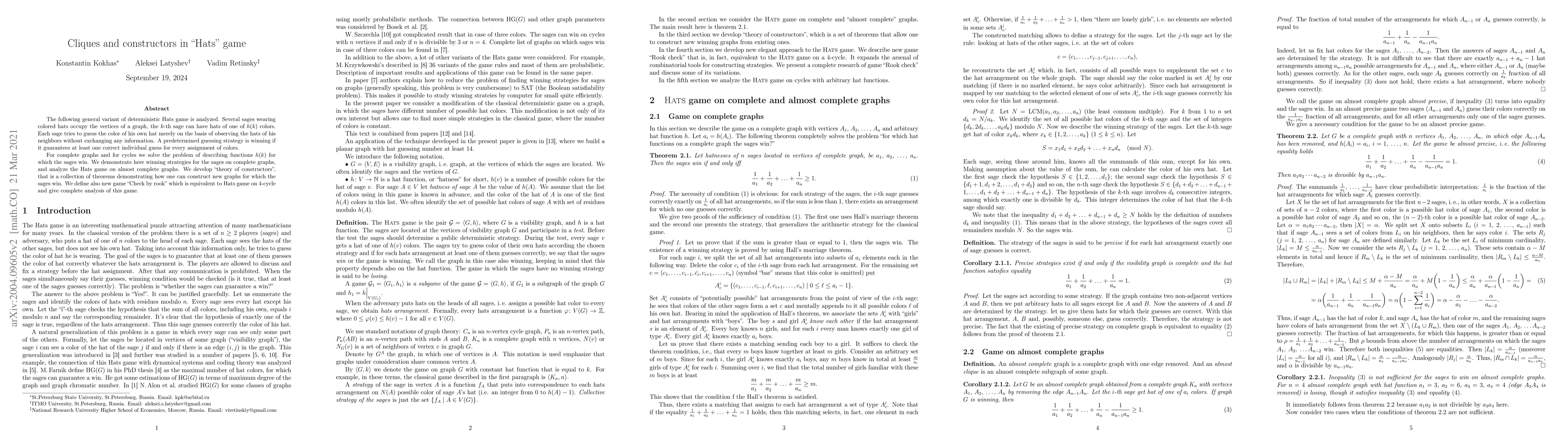 The following general variant of deterministic Hats game is analyzed. Several sages wearing colored hats occupy the vertices of a graph, the $k$-th sage can have hats of one of $h(k)$ colors. Each sage tries to guess the color of his own hat merely on the basis of observing the hats of his neighbors without exchanging any information. A predetermined guessing strategy is winning if it guarantees at least one correct individual guess for every assignment of colors. For complete graphs and for cycles we solve the problem of describing functions $h(k)$ for which the sages win. We demonstrate here winning strategies for the sages on complete graphs, and analyze the Hats game on almost complete graphs. We develop "theory of constructors", that is a collection of theorems demonstrating how one can construct new graphs for which the sages win. We define also new game "Check by rook" which is equivalent to Hats game on 4-cycle and give complete analysis of this game.