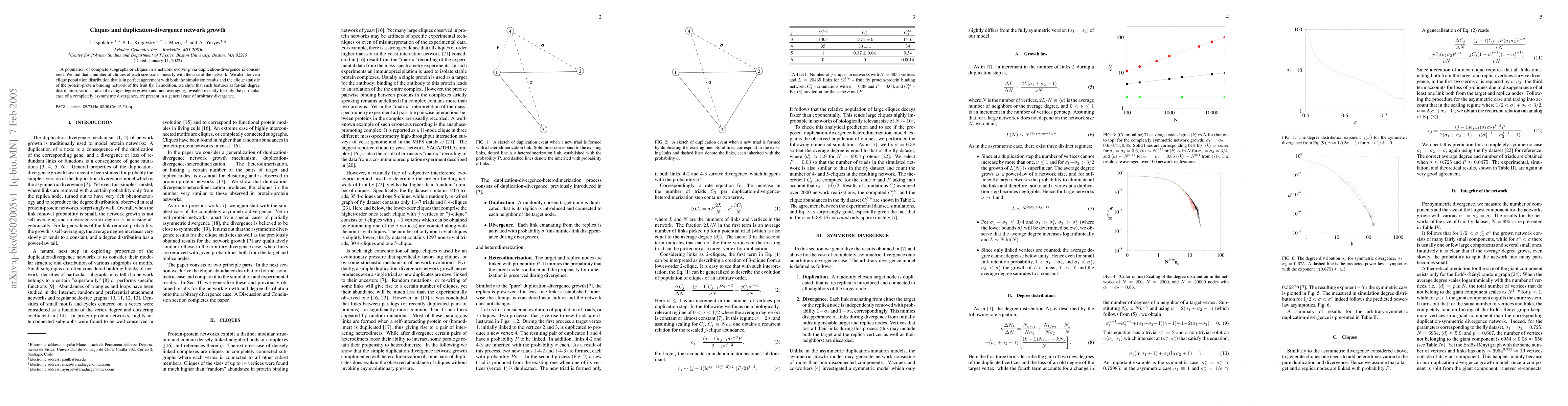 Researchers studied how cliques form in networks that grow through duplication-divergence. They found that certain clique populations scale linearly with network size and match real-world patterns.