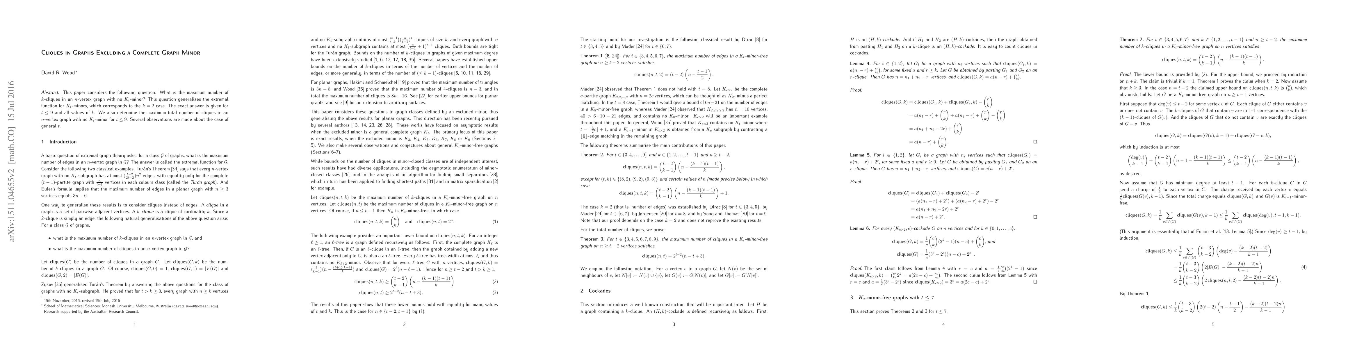 This paper provides exact values for the maximum number of k-cliques in an n-vertex graph without a K_t-minor for t≤9 and all k. It also determines the maximum total number of cliques under the same conditions. The study offers observations on the general case for t.