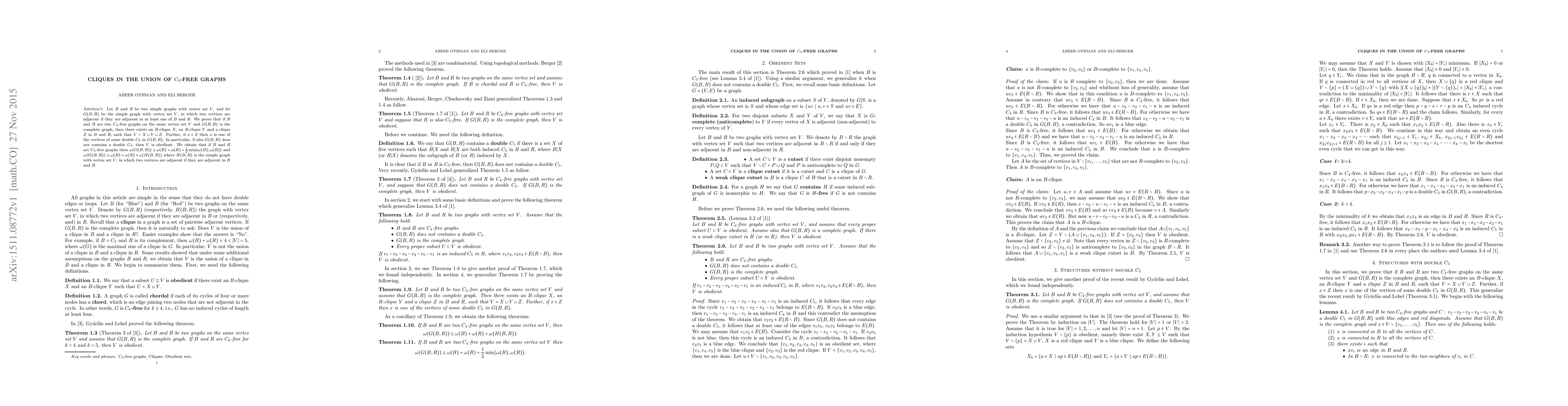 Let $B$ and $R$ be two simple graphs with vertex set $V$, and let $G(B,R)$ be the simple graph with vertex set $V$, in which two vertices are adjacent if they are adjacent in at least one of $B$ and $R$. We prove that if $B$ and $R$ are two $C_4$-free graphs on the same vertex set $V$ and $G(B,R)$ is the complete graph, then there exists an $B$-clique $X$, an $R$-clique $Y$ and a clique $Z$ in $B$ and $R$, such that $V=X\cup Y\cup Z$. Further, if $x\in Z$ then $x$ is one of the vertices of some double $C_5$ in $G(B,R)$. In particular, if also $G(B,R)$ does not contains a double $C_5$, then $V$ is obedient. We obtain that if $B$ and $R$ are $C_4$-free graphs then $\omega(G(B,R))\leq \omega(B)+\omega(R)+\frac{1}{2}\min(\omega(B),\omega(R))$ and $\omega(G(B,R))\leq \omega(B)+\omega(R)+\omega(H(B,R))$ where $H(B,R)$ is the simple graph with vertex set $V$, in which two vertices are adjacent if they are adjacent in $B$ and $R$.