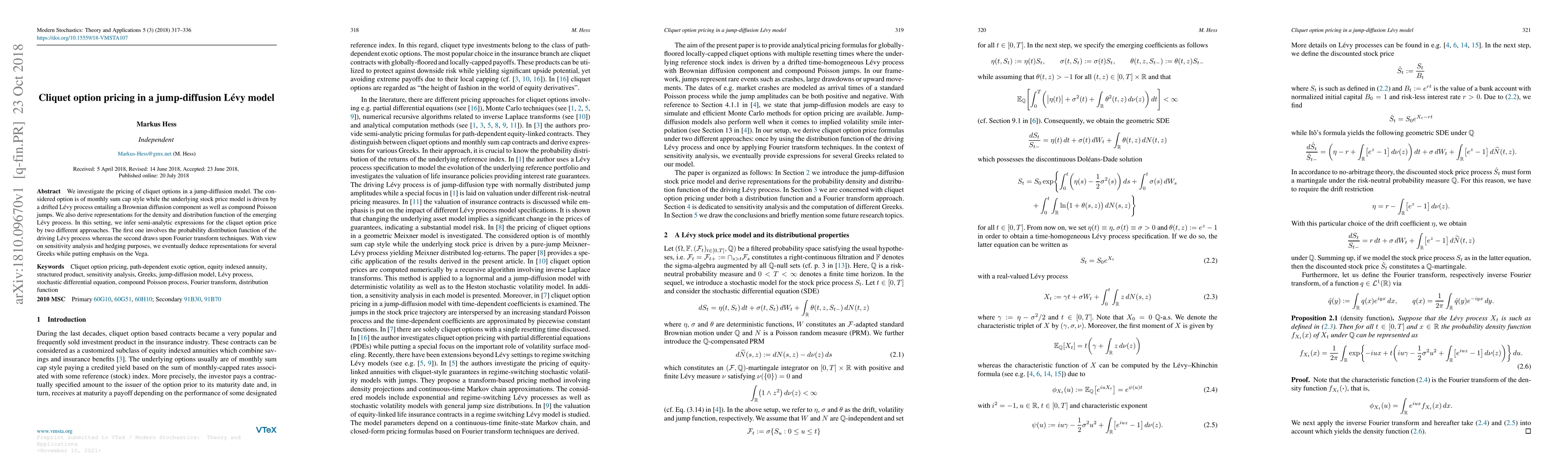 This paper prices monthly sum cap cliquet options within a jump-diffusion Lévy model, deriving semi-analytic expressions using both probability distribution and Fourier transform methods. It also provides representations for the Greeks, with a focus on Vega, for sensitivity analysis and hedging.