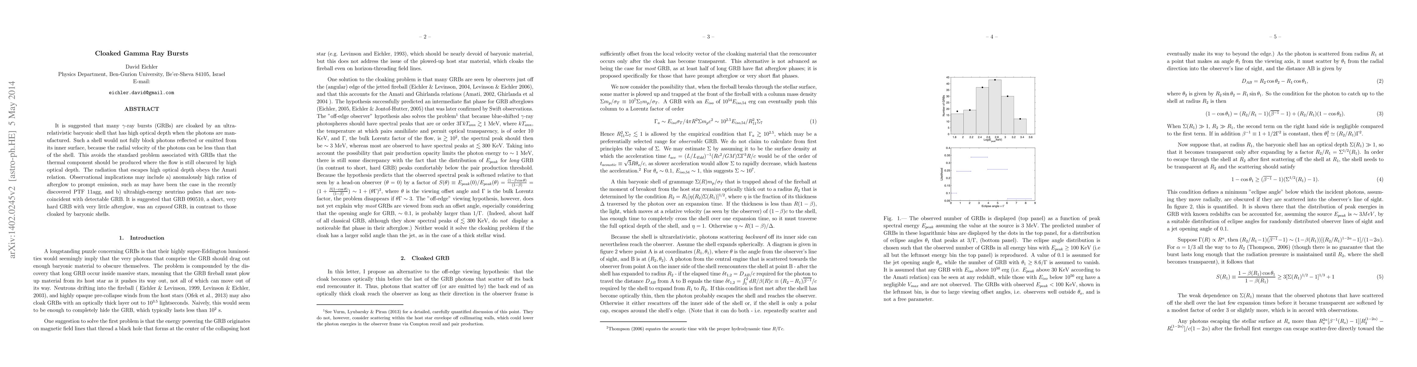 It is suggested that many $\gamma$-ray bursts (GRBs) are cloaked by an ultra-relativistic baryonic shell that has high optical depth when the photons are manufactured. Such a shell would not fully block photons reflected or emitted from its inner surface, because the radial velocity of the photons can be less than that of the shell. This avoids the standard problem associated with GRBs that the thermal component should be produced where the flow is still obscured by high optical depth. The radiation that escapes high optical depth obeys the Amati relation. Observational implications may include a) anomalously high ratios of afterglow to prompt emission, such as may have been the case in the recently discovered PTF 11agg, and b) ultrahigh-energy neutrino pulses that are non-coincident with detectable GRB. It is suggested that GRB 090510, a short, very hard GRB with very little afterglow, was an {\it exposed} GRB, in contrast to those cloaked by baryonic shells. \end{abstract}