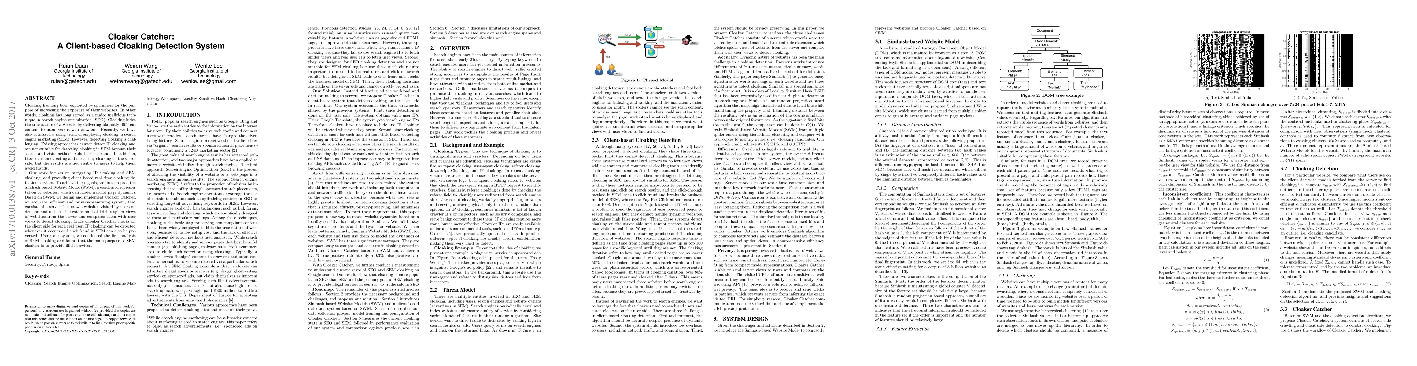 Cloaking has long been exploited by spammers for the purpose of increasing the exposure of their websites. In other words, cloaking has long served as a major malicious technique in search engine optimization (SEO). Cloaking hides the true nature of a website by delivering blatantly different content to users versus web crawlers. Recently, we have also witnessed a rising trend of employing cloaking in search engine marketing (SEM). However, detecting cloaking is challenging. Existing approaches cannot detect IP cloaking and are not suitable for detecting cloaking in SEM because their search-and-visit method leads to click fraud. In addition, they focus on detecting and measuring cloaking on the server side, but the results are not visible to users to help them avoid frauds. Our work focuses on mitigating IP cloaking and SEM cloaking, and providing client-based real-time cloaking detection services. To achieve these goals, we first propose the Simhash-based Website Model (SWM), a condensed representation of websites, which can model natural page dynamics. Based on SWM, we design and implement Cloaker Catcher, an accurate, efficient and privacy-preserving system, that consists of a server that crawls websites visited by users on demand and a client-side extension that fetches spider views of websites from the server and compares them with user views to detect cloaking. Since Cloaker Catcher checks on the client side for each real user, IP cloaking can be detected whenever it occurs and click fraud in SEM can also be prevented. Using our system, we conducted the first analysis of SEM cloaking and found that the main purpose of SEM cloakers is to provide illicit services.