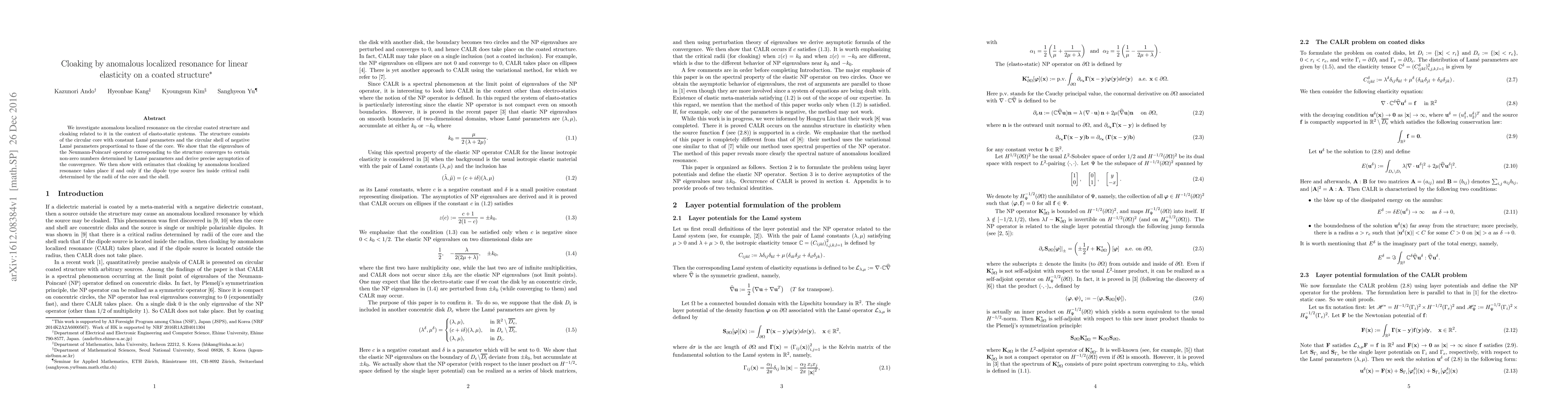 This paper explores cloaking via anomalous localized resonance in linear elasticity on a coated circular structure, demonstrating that cloaking occurs when a dipole source is within specific radii determined by the structure's core and shell dimensions. The study derives the convergence of the Neumann-Poincaré operator's eigenvalues and provides precise asymptotics for this convergence.