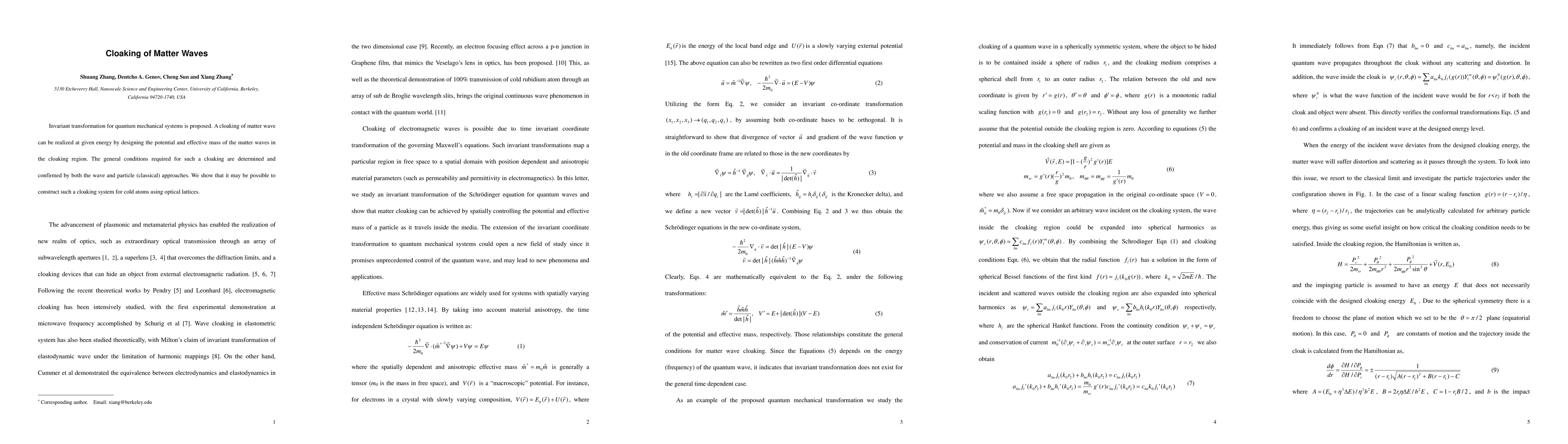 This research proposes an invariant transformation for quantum systems, enabling the cloaking of matter waves at specific energies. The method involves designing potential and effective mass in the cloaking region, confirmed by wave and classical approaches. The study suggests the feasibility of constructing such a cloaking system for cold atoms using optical lattices.