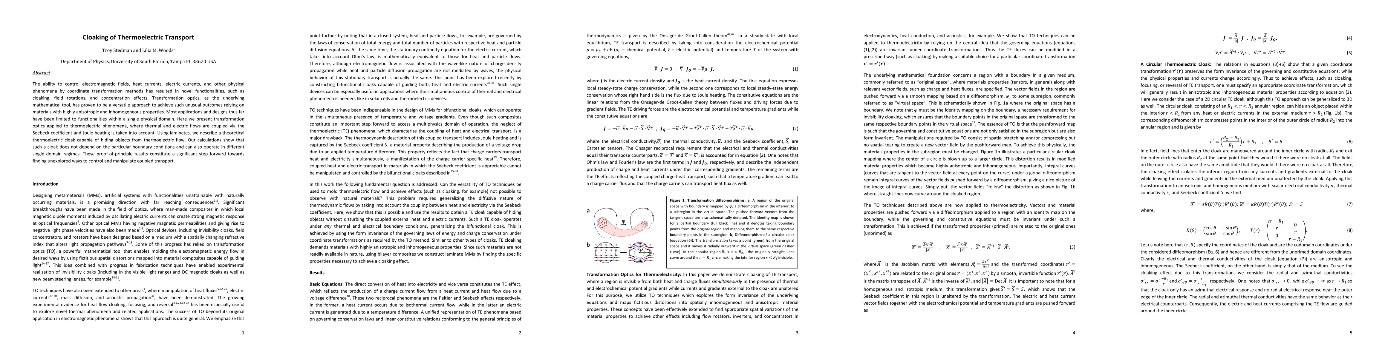 The ability to control electromagnetic fields, heat currents, electric currents, and other physical phenomena by coordinate transformation methods has resulted in novel functionalities, such as cloaking, field rotations, and concentration effects. Transformation optics, as the underlying mathematical tool, has proven to be a versatile approach to achieve such unusual outcomes relying on materials with highly anisotropic and inhomogeneous properties. Most applications and designs thus far have been limited to functionalities within a single physical domain. Here we present transformation optics applied to thermoelectric phenomena, where thermal and electric flows are coupled via the Seebeck coefficient and Joule heating is taken into account. Using laminates, we describe a theoretical thermoelectric cloak capable of hiding objects from thermoelectric flow. Our calculations show that such a cloak does not depend on the particular boundary conditions and can also operate in different single domain regimes. These proof-of-principle results constitute a significant step forward towards finding unexplored ways to control and manipulate coupled transport.