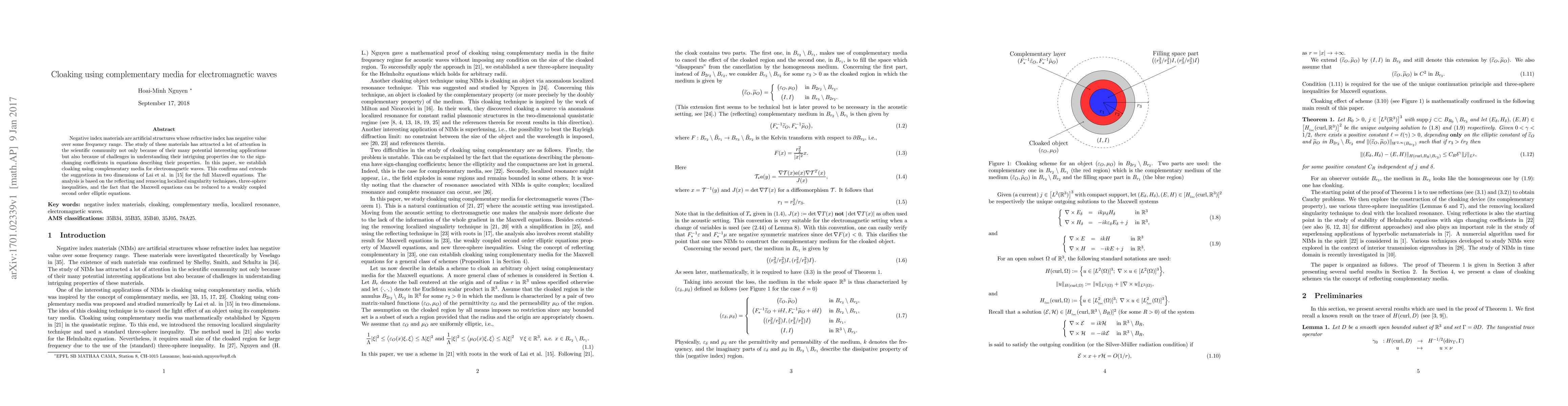 This paper develops a method for electromagnetic wave cloaking using complementary media, confirming and extending prior two-dimensional studies by utilizing reflecting techniques, singularity removal, three-sphere inequalities, and weakly coupled second-order elliptic equations based on Maxwell's equations.