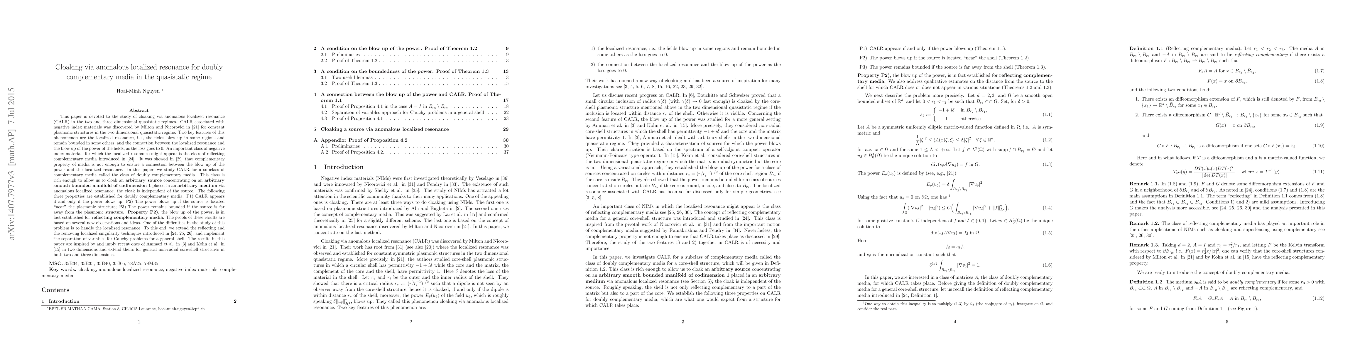 This paper is devoted to the study of cloaking via anomalous localized resonance (CALR) in the two and three dimensional quasistatic regimes. CALR associated with negative index materials was discovered by Milton and Nicorovicci in [21] and attracted a lot attention in the scientific community. Two key figures of this phenomenon are the localized resonance, i.e., the fields blow up in some regions and remain bounded in some others, and the connection between the localized resonance and the blow up of the power of the fields as the loss goes to 0. An important class of negative index materials for which the localized resonance might appear is the class of reflecting complementary media introduced in [24]. It was showed in [29] that complementary property of media is not enough to ensure a connection between the blow up of the power and the localized resonance. In this paper, we study CALR for a subclass of complementary media called the class of doubly complementary media. This class is rich enough to allow us to cloak an arbitrary source concentrating on an arbitrary smooth bounded manifold of codimension 1 placed in an arbitrary medium via anomalous localized resonance. The following three properties are established for doubly complementary media: 1) CALR appears if and only if the power blows up; 2) The power blows up if the source is near the plasmonic structure; 3) The power remains bounded if the source is far away from the plasmonic structure. Property 2), the blow up of the power, is in fact established for reflecting complementary media...